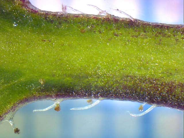 | ▼若葉の葉柄に腺毛があり、枝は無毛。 | ▼葉柄の腺毛と毛。 | ▼若葉の縁に腺毛が散生する。 |