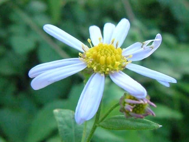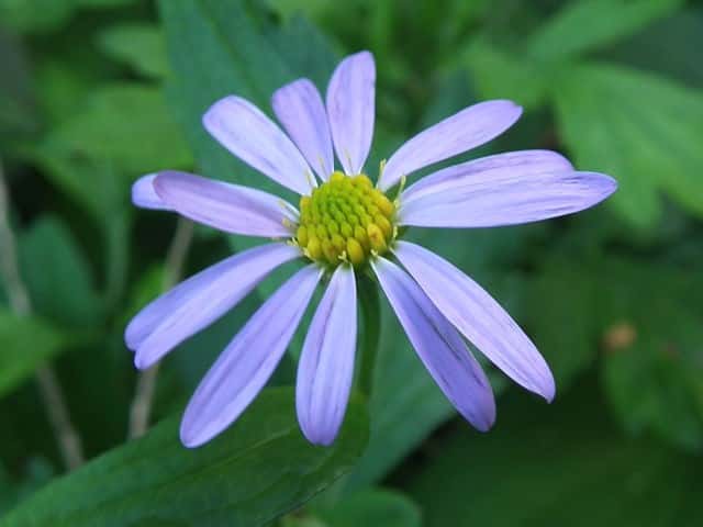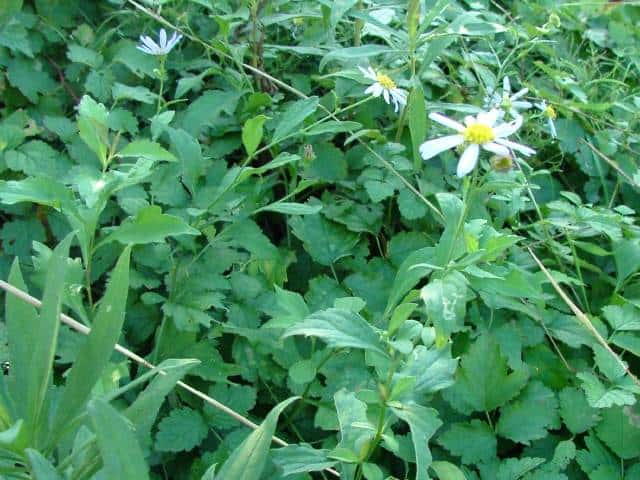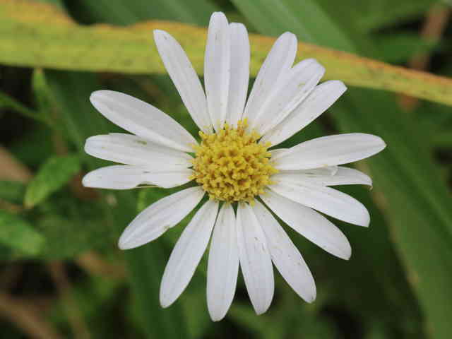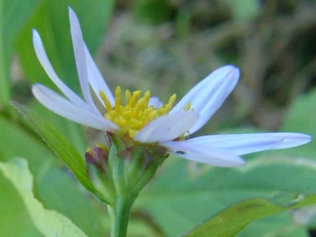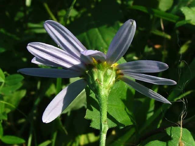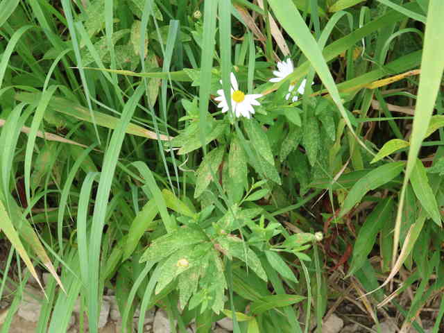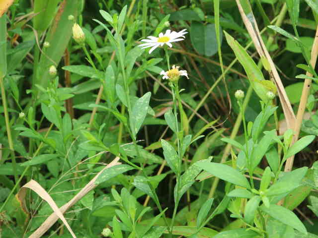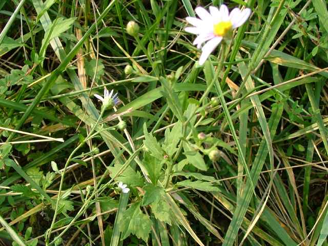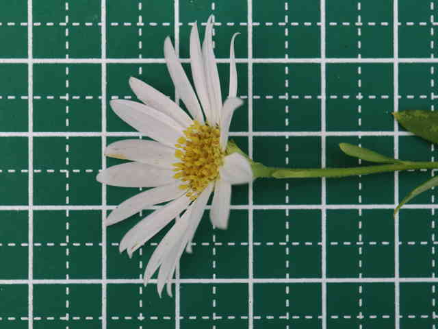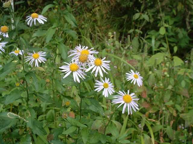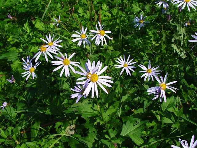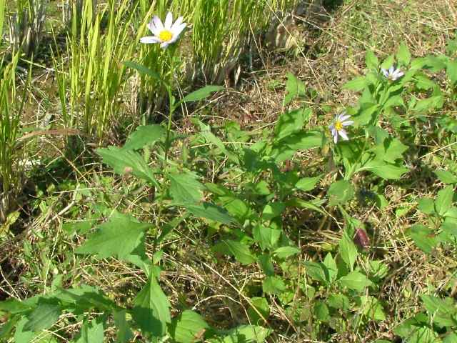 | 多年草 本州(中部地方以西)〜九州の山野の湿ったところにや道ばたにふつうに生える。高さ0.5〜1.2m。茎ははじめ赤みを帯び、上部でよく枝分かれする。茎の下部や中部の葉は長さ8〜10cm、幅約3cmの卵状長楕円形で、ふちには粗い鋸歯があり、3脈がやや目立つ。枝先に直径約3cmの帯青紫色の頭花を1個ずつつける。そう果は長さ約3mmの扁平な倒卵形で、冠毛は長さ約0.5mm。花期は7〜10月。(野に咲く花) 舌状花はふつう淡紫色だが、ときに白色で15〜20個前後。(日本の野菊) 学名は、Aster yomena キク科シオン属 よく似たノコンギクは冠毛が4〜6mmあり、全体に毛が多い。またオオユウガギクは冠毛が1mm。 |