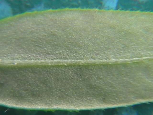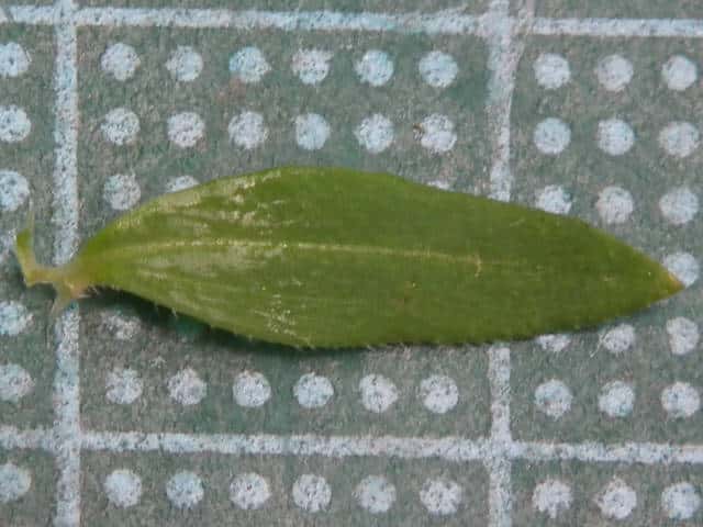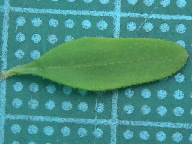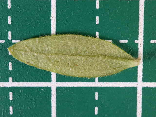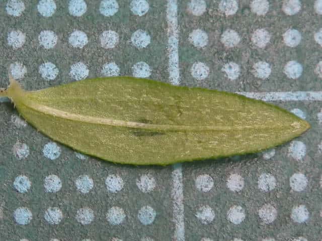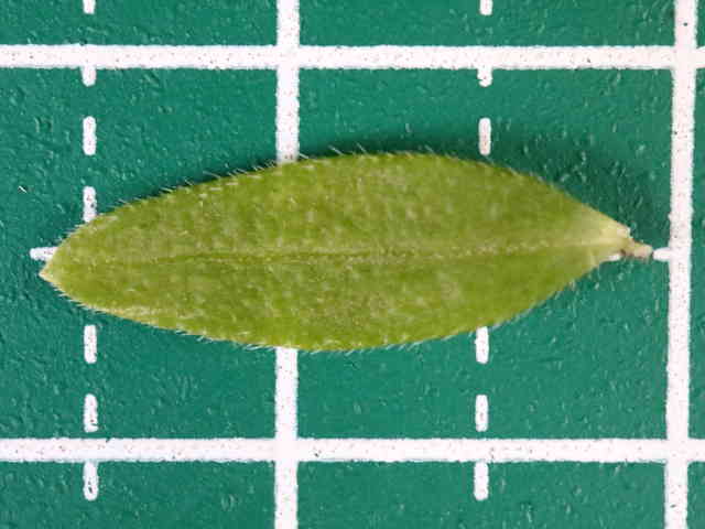 | ▼葉は長さ約1.5cm、縁に毛がある。 | ▼幅は約5mm。 | |