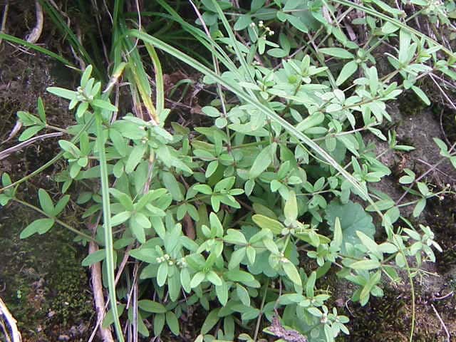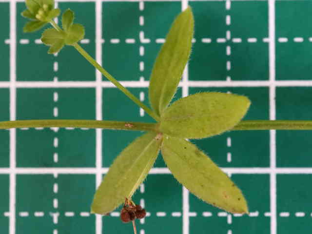 多年草 北海道〜九州の田の畦や道ばたに多い。高さ20〜50cm。茎は4稜が形で細くて無毛。基部はときに地に伏す。葉は4個輪生し、長さ0.6〜1.5cm、幅3〜6mmの卵状長楕円形または卵形で、先端は短くとがり、ふちや裏面には白い毛がある。4個の葉のうち2個は托葉が変化したもので、ふつうすこし小さい。茎の先や葉腋から短い花序を出して、淡黄緑色で直径約1mmの小さな花を数個つける。果実は2個の分果からなり、曲がったこぶ状の突起が密生する。花期は5〜6月。(野に咲く花) 小花柄は長さ1〜5mm。 学名は、Galium trachyspermum アカネ科ヤエムグラ属 よく似たヒメヨツバムグラは葉の幅1.5〜2.5mm。 |