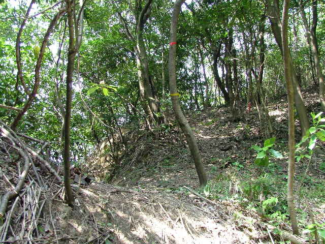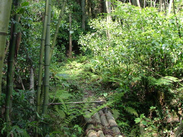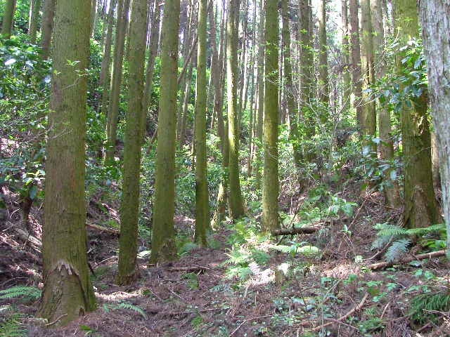 | 杉の植林地を進む。 | 13時25分 稜線に到着。ここを左へ。 |