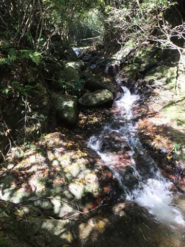 | 今日はシオデの果実の様子を見てから、林道澄水山線を上がり、白滝や大滝の場所を確認しようと出かけました。 途中で去年見つけたブラジルハシカグサモドキの場所を見てみると、去年と同じような様子で花が咲いていました。 シオデは前回から1ヶ月ほど立ち、草刈りでなんとか残っていた数個の果実が黒く色づいていました。 林道脇から水の流れ落ちる音を頼りに道を下がると、斜面の木々の向こうに水の流れが見えます。以前はここまででやめていたが、荒れた斜面をなんとか下りると、白滝の上下2段の滝の中間に出ました。下部の滝の滝壺には、急な斜面のため下りられないようです。 大滝へは鉄塔巡視路を歩き、2つ目の鉄塔を過ぎて急斜面の細い道をしばらく行った先の谷の奥にあるようです。夏に来た時には竹藪のため先へ進めず諦めましたが、今回見逃したルートがないかと見渡してみました。しかし、谷の奥に水の流れるような音は聞こえますが、簡単に歩いて行けるようなルートはありませんでした。やはり、大滝へは行けそうにもないようです。 |