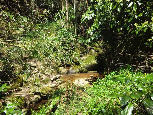 | 12:46 杉林の中を川を左右に渡りながら進む。 |