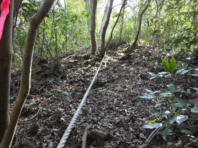 | 12:58 急な斜面をロープを頼りに上がる。 |