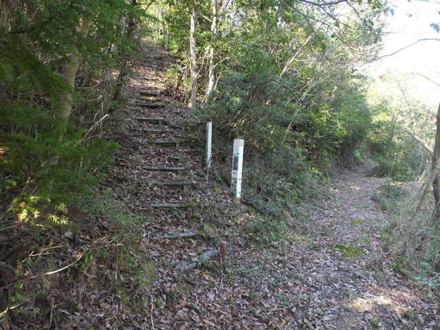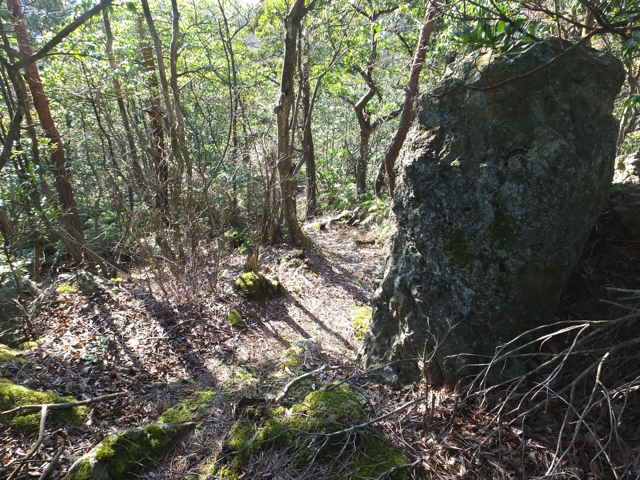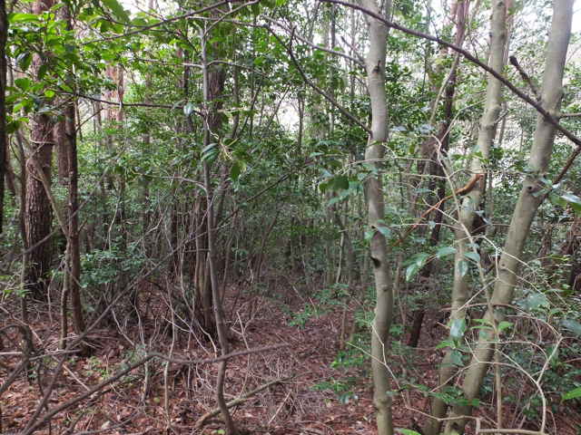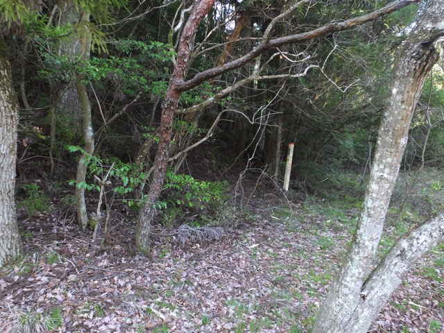 | 今日は玉湯町の上野山、室山へ上がり、時間があれば八雲町と東出雲町の境にある宝満山、また東出雲町の古城山に上がってみようと思います。 上野山(236.7m)は玉湯町が宍道町に接するところにありますが、ネットにも登山情報はありません。今回は、玉湯町から宍道町へ抜ける林道上野山線の道路脇から作業道へ入り、山を回ったところから入ってみようと思います。 道路を奥に入ると、急傾斜だった山が道路脇から入れるようになるので、上がってみることにしました。草やシダはなく、木や茨もまばらなので、なんとか尾根まで上がることができました。頂上はもう一つ先のピークなので、一旦鞍部へ下りてから斜面を上ります。 頂上部分はブッシュも多く見通しがきかないので、三角点を探してもなかなか見つけられませんでした。諦めようかと茂みを回りこんでみると、白い三等三角点(上野山 236.70m)の標示杭が見えました。頂上は木々に囲まれ、全く眺望はありません。 下りは同じルートを下がろうとしたものの、上がったルートが見つからず手前から斜面を下ってしまい、急斜面の場所に出てしまいました。少し引き返し、緩斜面の方へ下りましたが、道路から高い場所で下りることができず、最初に山へ入った場所まで行くことになりました。 室山(159.3m)は、玉湯町林にありますが、この山もネットに登山情報はありません。高速の側道から作業道が山へ向かっているので、ここから登れるのではないかと、上がってみました。調整池の上には展望台があり、公園になっているようです。 作業道を奥に進み、上に上がるように右へと分岐し、斜面を上ったところで、左へと行き、2度右へと分岐し上がっていきました。作業道が終点となり、斜面を上へと上がると、目の前に作業道がありました。先ほどの分岐が間違っていたようなので、確認のために分岐まで引き返し、左へと進んでみました。この先で作業道は終点となり、急な斜面を木々に掴まりながら上がっていくと、平坦な場所にたどりつきます。 頂上部分は若干開けた場所になっており、三角点(林 159.34m)はすぐに見つかりました。三角点からは、反対方向へ不明瞭ながら踏み跡が続いているようなので、向かってみることにしました。 最初は踏み跡が草の中で不安がありましたが、植林地に出ると、植林地の脇に踏み跡らしきものが続いていました。急斜面を下りると道路脇へ下りてきました。山の西側は植林が進んでいるようです。踏み跡脇に古いテープが残っていたので、こちらが登山道になっていたのでしょう。 宝満山(147m、126.3m)は八雲町と東出雲町との境にありますが、2つの峰があり、地理院地図は2つの峰の間に宝満山の表記があり、他の地図では三角点のある方に宝満山の表記があります。2つの峰を結ぶように鉄塔があるので、鉄塔巡視路を歩けば、縦走ができると思われます。 八雲町東岩坂川原地区の河原神社から500mほど道路を奥へ入ったところの作業小屋のある田んぼの脇から山へ入ります。細い道は笹が多いですが、少し入ると鉄塔巡視路に合流します。 巡視路は急な斜面を上がると、尾根にたどりつきます。山の北側は植林のために伐採されているので、中海方面の眺望が開けています。頂上付近は木々もまばらで開けている感じです。頂上から少し進んだ所に鉄塔があり、その先に巡視路が続いています。 巡視路は下り、最後は急斜面となって、一旦鞍部におります。鞍部の平場を進むと、その先に鉄塔の案内標識が見えます。ここからまた急斜面をつづら折れに上がっていくと、鉄塔があります。頂上はこの鉄塔を通り過ぎ一段高くなっている場所で、ブッシュの中に三角点(水越 126.27m)がありました。三角点を示す白い標示杭は見あたりませんでした。頂上からの眺望はありません。 三角点の先に巡視路は続いており、大きな岩のあるところから下がって行くと、2本の鉄塔のある場所にでてきます。鉄塔敷地は急斜面になっており、その下の方に巡視路が続いています。巡視路は樹林内を進み、やがて明るい林の先に道路が見えてきます。 古城山(57.3m)は東出雲町竹花にある小さな山ですが、県道大東東出雲線のバイパスにより分断されています。ネットには登山についての情報はありません。どんな山なのか様子を見ようと、近くの西側の道を通ってみると、山へと入っていく道がありました。どこまで行けるのか入ってみました。 山道を進むと、植林された林内の谷へと道は続き、両側は急斜面になっています。谷の奥へ進むと、シダが生えた短い斜面があり、尾根に上がれそうです。尾根に上がると、木々はまばらで、踏み跡がありそうな感じで、頂上へ向かって楽に進めました。頂上には白い標示杭があり、三等三角点(古城山 57.28m)が確認できました。 三角点の先へ向かって尾根筋に踏み跡があるような感じなので、進んでみましたが、途中でシダも多く藪のような状態になり、時間もないので引き返すことにしました