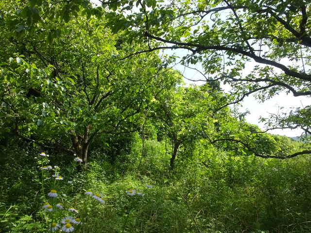 | 今日は美保関町雲津にある寺尾山へ上がることにしました。地理院の点の記には、墓地に隣接する民家の脇から山へ入り、谷を上がって尾根を進むコースが載っています。 美保関に向かう途中で先日写した、ハナハマセンブリの根生葉のないことの確認をしました。 山の中で対生の葉の腋に花を固めてつけているものに出会いました。キョウチクトウ科のカモメヅルの仲間だろうと思いました。足場は悪いし、日陰ではあり、ピントが合わないし、手ブレで、全く写真になりませんが、なんとか花の様子は写ったようです。 帰りに諸喰に寄って、2013年7月に黄色い葯をつけたヒメフウロと思われるものを写した同じ場所で確認しましたが、赤い葯をつけていました。2013年に写したものは葯の色以外はヒメフウロの要件を満たしているので、黄色い葯をつけることもあるというのは本当のようです。 雲津の湾岸の道路沿いにある墓地に隣接する家の脇に奥に入る小径がありました。人家の庭先で道が終わるかのようですが、人家の脇を通ってさらに奥の畑に道は続いていました。道は植林地内を進んでいきますが、地図を見ながら谷へ入る辺りで左折し、小さな流れを渡って、草に埋もれた谷沿いに上がって行きました。 谷はだんだんと急になり、木々に掴まりながら上がりますが、草に埋もれた倒木などがあり歩きにくいので、谷はあきらめ左へ回って、草の生えていない斜面を上がることにしました。しかし、この斜面はものすごい急斜面で、木々に掴まりながらやっとの思いで上がっていくと、すぐに尾根が近くなり、緩斜面になりました。 尾根は踏み跡が続いており、木々も道幅ほど切られているような感じで、歩きやすくなっていました。登りの尾根は高い方へ進んでいけばいいので、方向を誤ることはほとんどありません。三角点(193.0m)は白い標示杭はありませんでしたが、開けた場所にあったので、すぐにわかりました。地図では三角点の近くに寺尾山の名が記されていますが、三角点名は「雲津」なので、寺尾山の頂上は201mのピークなのかもしれません。或いは2つのピークを持った山なのかもしれません。201mのピークへも踏み跡は続いています。両ピークとも木々に囲まれ全く眺望はありません。 尾根を下るときには、注意をしていないと、歩きやすい方向へと足が向いてしまい、違う方向へ進んでしまうことがよくあります。 登りのときに谷から尾根へ上がった場所から、北西へ伸びる尾根に踏み跡が続いているので、そちらへ向かってみることにしました。左に折れる踏み跡がありましたが、直進すると道が消え、その先は急な斜面になっていました。ここまで来たのだからと、急斜面を下りてみますが、全くの藪で、人の通ったような気配すらありませんでした。やがて谷は密生した竹藪となり、斜面はウラジロが重なりあった藪となって、身動きができないような状態になってしまいました。 なんとかウラジロの藪をつっきて、更に竹藪を下がり、場所を確認すると海岸へ下がりすぎているようでした。これ以上下がらずに斜面を回って行くと、上へ続いている古い踏み跡がありました。竹藪の中のこの踏み跡を辿って、上がっていくと、目の前が明るくなって、柿の木が植えられた畑に出てきたので、ひと安心しました。 この畑を下りて行くと、地形図にある破線の道に続いています。畑は草に覆われていましたが、山の中の道ははっきりしており、しばらくで海岸沿いの民家の脇へ下りてきました。 この谷に下りてしまった下山ルートは間違っていて、お勧めなどはできないルートです。手前にあった左へ曲がっていた道が尾根を下るルートだったのかもしれません。 帰りに諸喰への道で馬見山の様子を見ましたが、先日登った入口以外には、山へ入る道はないようでした。 |