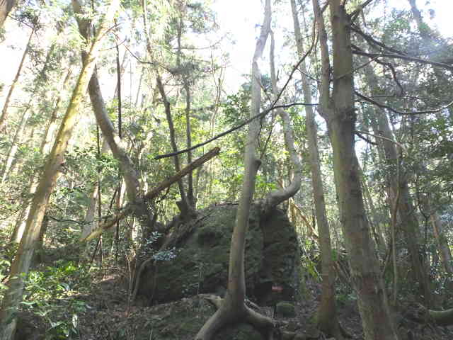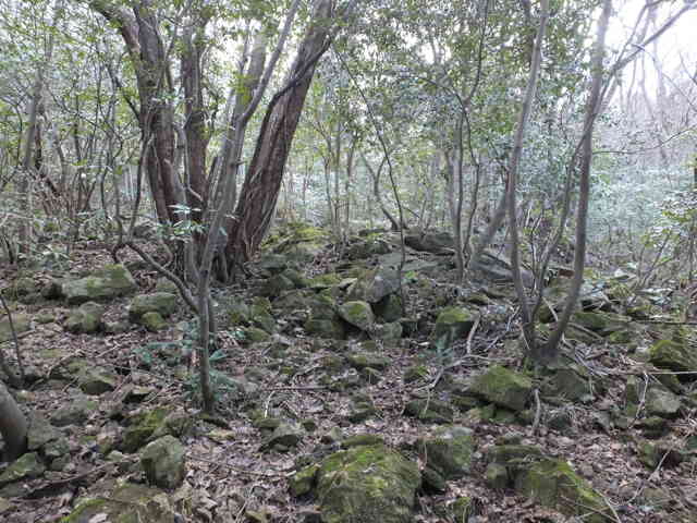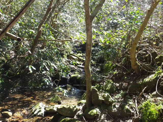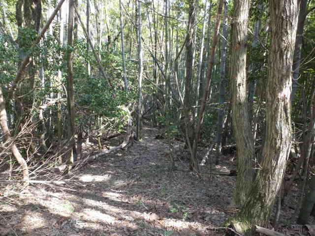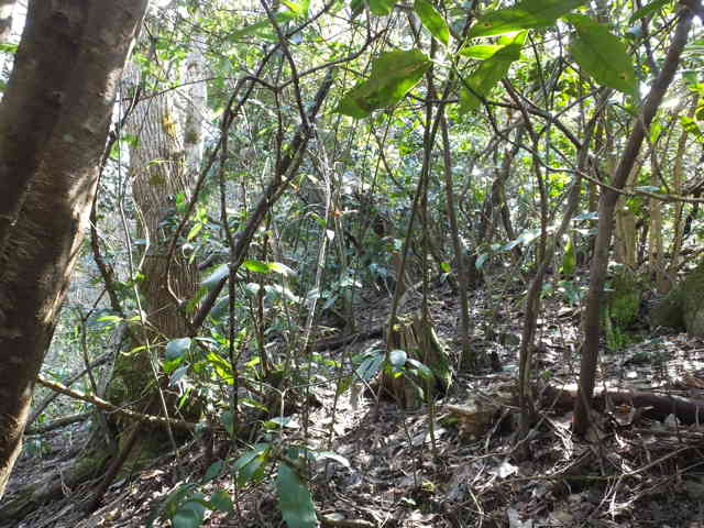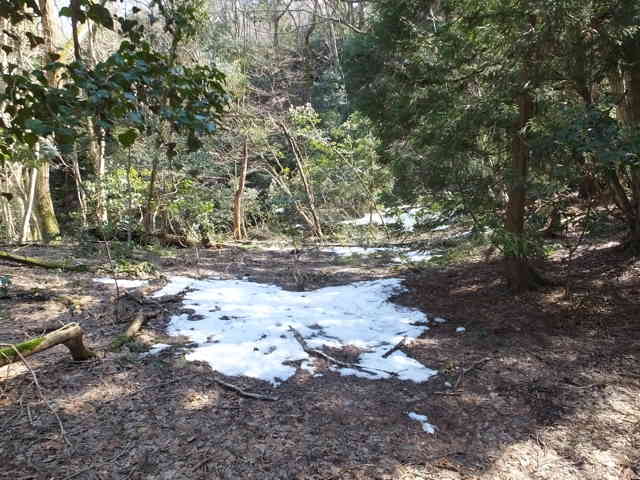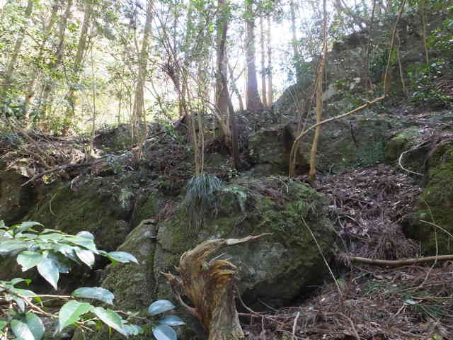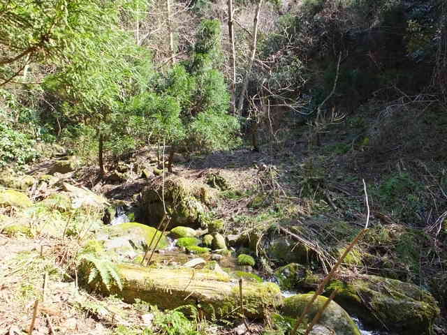 | 今日は12月12日に同じ谷を上がり、左の尾根から山伏塚への入口に上がったので、今回は途中から右の尾根へ上がり、山伏塚を目指すことにしました。 以前と同じように山口谷コースへ向かう途中の橋の手前から谷へ入り、川沿いに上がっていきます。10分ほど上がると、川の両岸が岩山となり、その間を川が流れるようになるので、川へ降りて岸を進みます。岩を抜けて10分ほどで大きな滝があり、斜面を滝の上部へ上がります。滝を越えてから10分ほど行くと、谷が2つに分かれるところがあり(先日は右の谷へ上がった)、ここから先へ行くと、両側の斜面も急になるので、この手前から尾根へ向かって斜面を上がります。 斜面は人が通った様子もなく、藪となっていますが、通れない状況でもないので、枝を切り払いながら上がります。15分ほど藪を上がると、藪は終わりますが急斜面が続きます。しだいに岩が多くなって、ピークに着くと山伏塚で、越えたところは広場になっています。 広場を南に向かうと京羅木山の縦走路へ出会うはずですが、南側には急斜面があり、正面からは上がれそうにはありません。右へ回ってなんとか斜面を上がると、稜線の反対側には溜池がありました。 ここから尾根を上がって行くと、腰の高さまである笹が多くなり、歩きにくいのですが、10分ほどでピークに上がると笹も終わり、さらに尾根を上がって行くと縦走路に出会いました。 帰りに荒田コースの途中から延びる尾根を下がってみましたが、途中から踏み跡もわからなくなり、またルートも東へ逸れて斜面を下ってしまい、時間もないので引返しました。 |