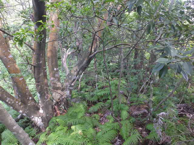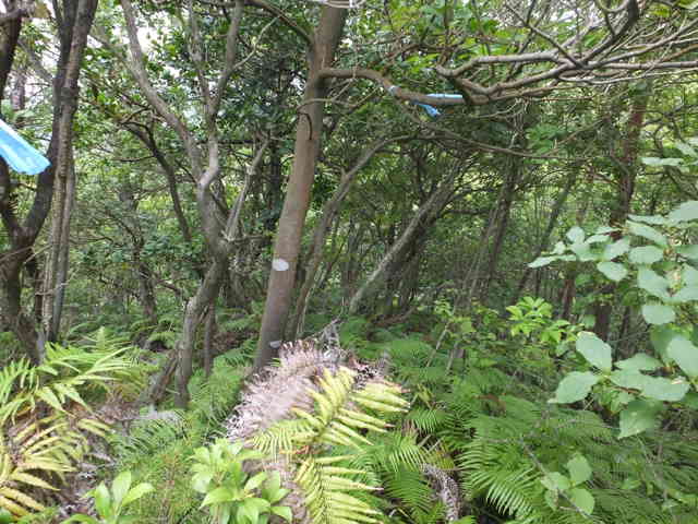 | 今日は、東出雲町の三角点を見に行きました。先日まだ開いていなかったカクレミノの雄花が咲きだしていました。高いところの花を手で掴みながらの撮影なので、ピントの合った写真が写せていません。マクロレンズの扱いに慣れていないので、アップで写そうとすると、どうしてもピントが浅くなってしまいます。 四等三角点(矢田 29.41m)は、道路脇の草むらに白い標示杭が見えました。三角点はコンクリート枡の中に埋め込まれているので、標示杭がなければ見つけにくいところでした。 四等三角点(山本 15.91m)は、竹矢小学校の敷地内のすべり台の近くにあるはずですが、ツツジの植え込みの中を何度も探しても見つかりませんでした。帰ってから調べると三角点は地下のコンクリート枡に埋められているようで、蓋がしてあると思われます。その蓋が砂に埋れているのかもしれません。再度確認する必要があります。 四等三角点(大山 129.98m)は須田地区の水田のつながる谷を入ったところから山へ登るようですが、「点の記」の場所がよくわかりません。田んぼの脇からは、猪避けの柵があるため入れませんし、田んぼをはずれたところは、荒れた草むらのため入ることもできません。入れる場所はないかと谷の奥へ入ってみると、柿畑の間が草刈りされているようで、山へ入れそうでした。山へ入ると正面は急斜面の植林地で、右へ回りながら、斜面を尾根へ向かいました。尾根に上がると膝高のシダが多く、また細い尾根は踏み跡も見えず藪となっています。最近は人も通っていないようですが、古いナタ跡がありました。シダは深いところは、胸高のところもあり、歩くのに疲労が増します。 急斜面を上がり、最初の小ピークへ上がると尾根は右へと続き、一度鞍部へ下がります。次のピークへ上がると、尾根は右へ曲がり、その先の急斜面を上がると、傾斜の緩い場所が続きます。頂上部もシダが続き、最高点あたりのシダの中に白い標示杭の頭が見えました。 三等三角点(崎田 42.19m)は、道路脇から直登するとすぐのようなので、市道の峠付近で山へ入れる場所を探すと、藪の切れ間から踏み跡がありました。山へ入ると、踏み跡は見えませんが、疎らな木の間を高い方へ向かって上がると、平坦な場所に三角点がありました。 |