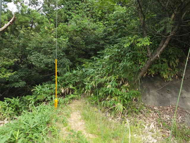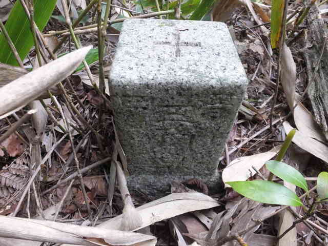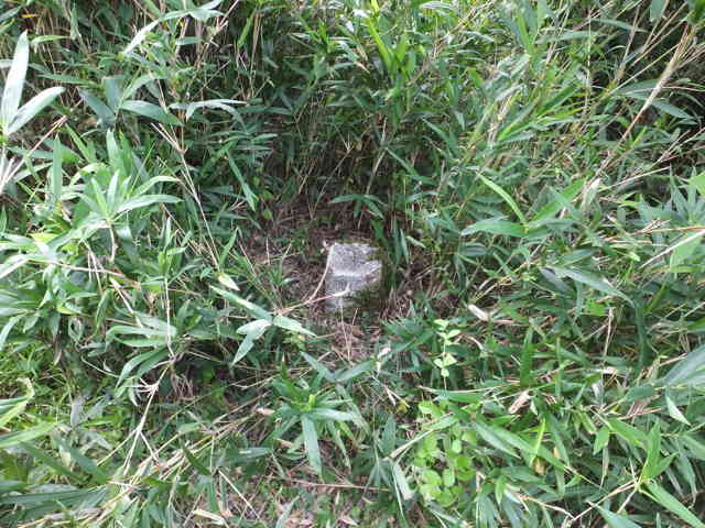 | クヌギの木の近くに石柱があった。 | 白い標示杭がないので見つけにくい。 | 二等三角点(矢筈越 410.6m) |
