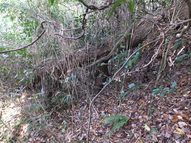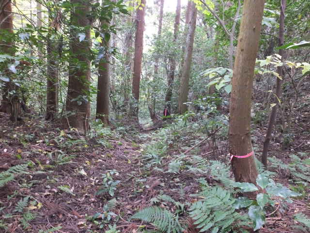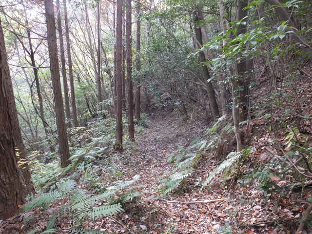 | 今日は、先日(10月15日)嵩山頂上から山を下るような踏み跡を見かけたので、確認に出かけました。 嵩山頂上近くのトイレ横から林内へ向かう踏み跡があり、広い小径が続いていました。2分ほど小径をたどると、目の前が明るくなり、大きな看板状のものが設置されていました。この径はマイクロ波の反射板の管理道だったようです。この先に径はないかと探しましたが、踏み跡らしいものは見えませんでした。また旧版の地形図にある谷へ降りる径もそれらしいものが見つかりませんでした。 また、旧版の地形図には嵩山頂上手前から熊井の滝へのルートの途中から分岐する径が載っているので、熊井の滝ルートへ入ってみました。分岐から5分ほど入ったところで、東側へ下る径のようなものがありました。しばらくは広くてしっかりした小径が続いていましたが、下るほどに小木が枝を伸ばし、歩きづらくなってきました。しばらくは枝を切り払いながら進むことができましたが。だんだん倒木や篠竹が多くなってきます。倒木を迂回しながら、篠竹の中に隠れた小径を探して進んでみましたが、ついには篠竹の藪の中に径が消えてしまいました。篠竹の向こうを覗いて見ても、道らしきものは見えず、藪は深いようなので、ここで諦めて引き返すことにしました。(旧版地形図を見ると、ここから斜面をトラバースして北へ向かっているようで、下りの径を探しても見つからなかったと思われます。) 参道ルートから登ってきた時に、紙谷地区からの径だろうと思われる南側への分岐があったので、確認してみることにしました。分岐には古いテープが巻いてありました。分岐からは、しばらく広い径が続いていますが、下ったところでは、竹林内の細い谷間の径になってしまいます。竹林を抜けると草地になって踏み跡がわからなくなりますが、正面の藪を避けて左へ回って下がると、竹林内に溜池があり、溜池からの流路に沿って竹林内を下がりました。竹林を抜けると、民家のすぐ裏手になる草地に出てきました。 ガガイモはすっかり葉を落として、果実もだいぶ黄色くなってきました。果実が少し細めなので、まともな種子が入っているのか心配ですが、観察を続けてみます。畑の隅の道路脇に果実をたくさんつけたシソ科と思われる植物がありました。花の姿は見えなかったので、来年の花を待たないと、何なのか判断は難しそうです。人家も近いことから、植栽された園芸種か逸出したものではないかと思われます。果実や葉の様子、花序の様子などからカリガネソウ(後日花を確認しました。)ではないかと思われます。 |