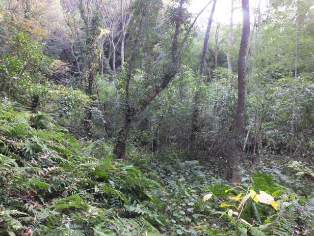 | 15:06 竹林の小径を下る。 | 15:09 竹林を抜けると草地となり踏み跡が不明になり、左へ行く。 | 15:11 溜池があり、竹林内を下がる。 |
