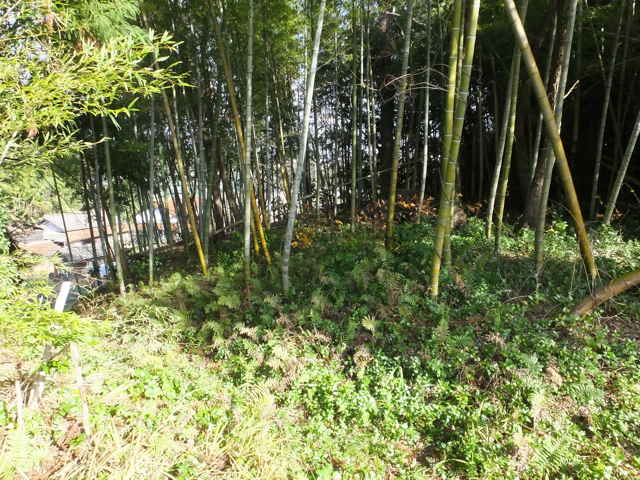 | 竹やぶの小径を進む。 | 尾根から斜面を下る。 | 正面は竹林で、左折し丘を下る。 |