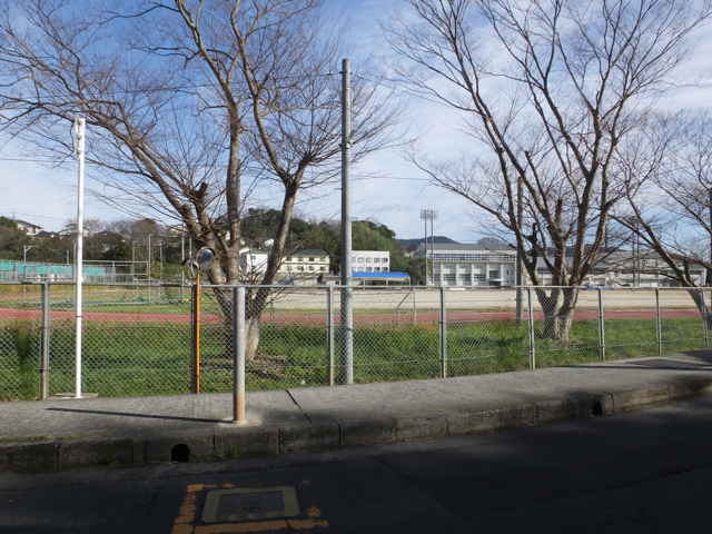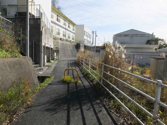 | 丘を下ってきた径。 | 小路の先に島大のグランドが見える。 | グランドはフェンスに囲まれ通れない。 |