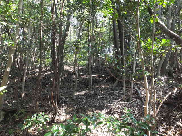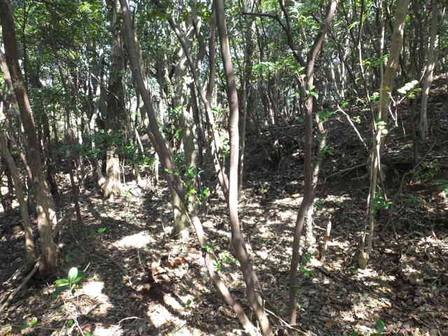 | 今日は、美保関町千酌にある三角点(高山、千酌)を見に行こうと思います。 三角点(高山)は、千酌の海岸から笠浦へ向かった峠の山にあります。峠の手前の斜面から山へ入れそうなので、荒れ地から林内の谷へ入ってみました。谷を上がって行くと、急斜面で上がれそうになくなるので、右手の尾根筋へ向かってみました。こちらも急斜面ですが、まばらに木があるので掴まりながら上がれます。尾根に上がると右へ尾根が伸びており、頂部で三角点を探しますが、なかなか見つかりませんでした。尾根道の中央にあるのですが、木の葉の影に隠れて、四等三角点(高山 76.20m)がありました。 千酌の海岸から千酌川に沿って田んぼの中を進み、枕木山(中国自然歩道)への標識を左に見ながら、右の谷へ入っていきます。山手へ入り、梅林の間を抜けると、舗装道と分岐し砂利道があるので、砂利道の方へ上がっていきます。この砂利道が林道枕木山線になるようです。尾根に上がったところで、左の斜面の竹藪から、三角点(千酌)のある小ピークへ上がれそうでした。竹藪へ入って斜面を上がって行くと、すぐに尾根になり、尾根には踏み跡があるようで、他から上がり口があるようです。頂上部は背の高いシダが密生し、三角点が見えません。白い標柱もないようで、30分ほどイバラを切りシダをかき分けて探しましたが、見つかりませんでした。 三角点(千酌)を諦め、林道枕木山線を上がりました。この林道は野波から続く林道里路線へ出会い、そこから枕木山へ繋がっています。林道枕木山線は前線未舗装で、急な坂道が続くので、自転車は乗ることができず40分ほど引っ張るのがやっとでした。 枕木山の駐車場の手前まで帰った所で、この付近に上本庄町川部から上がる文導寺越ルートの端があるはずなので、確認してみました。このルートは2008年に一度上がっていて、2012年に再度挑戦しましたが、川部の入口が草に覆われてルートが確認できなかったので、いつか確認しようと枕木山側の入口を見ておきました。駐車場近くの電柱「三坂山支26」付近に古い小径への入り口があり、小径をたどって電柱「三坂山支30」の手前に下り道があるように見えました。今回は時間がなく詳しい確認はできませんでした。 |