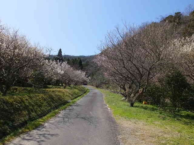 | 梅林の間を奥へ行く。 | 梅林の先から左へ曲がる。 | 未舗装の林道を上がる。 |