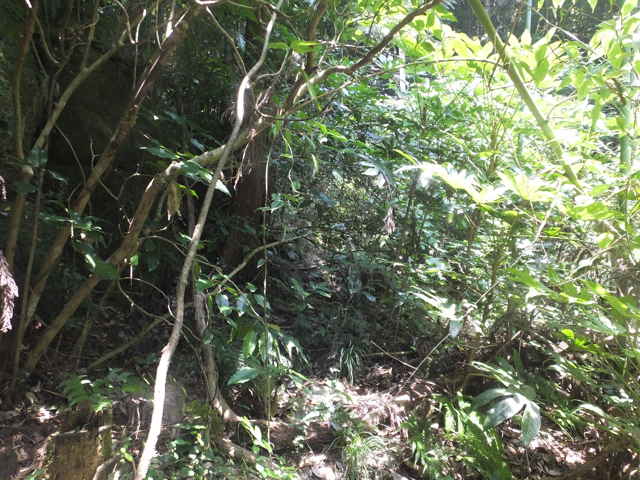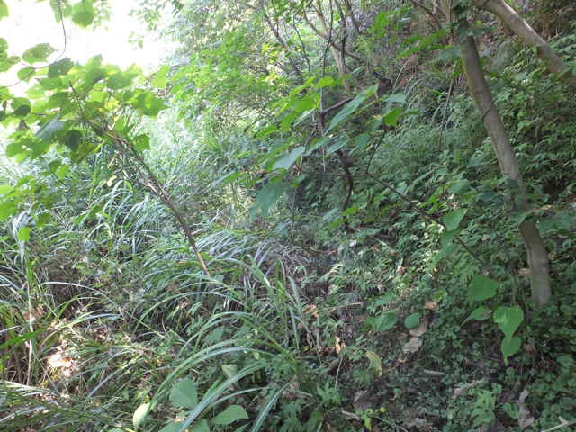 12:09 竹藪を抜けると木々の間に、古い踏み跡がある。 |