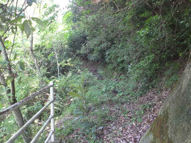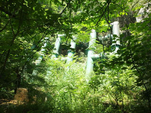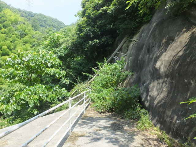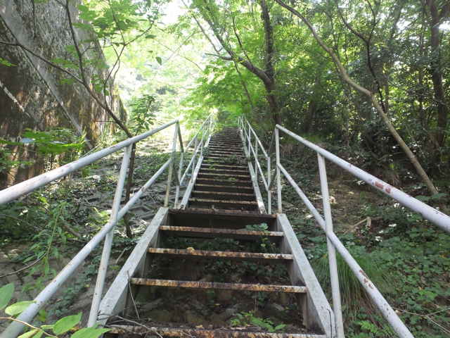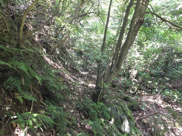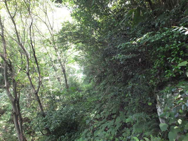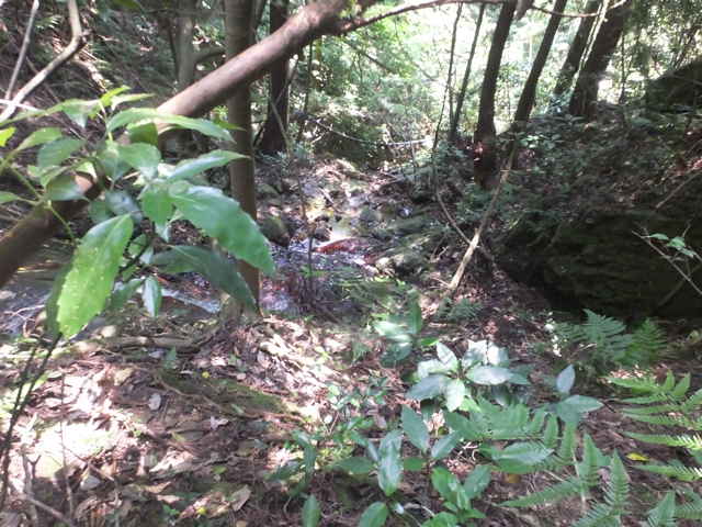 | 今日は、東持田町の大滝へ金井谷から上がってみることにしました。6月25日に鉄塔巡視路から向かってみましたが、地形図に記載のある場所には小さな滝しかありませんでした。谷から上がった情報と、巡視路から辿った情報が錯綜しているので、谷から上がって確認することにしました。しかし、以前にも谷から上がって最初の滝のところから進めず引き返しているので、どうなるでしょう。 金井谷川に沿った集落の奥に大きな堰堤があり、堰堤へ向かう道は背の高い草が生い茂っていました。以前は草などなかったような気がします。山際には背の高い草もないようなので、山際の藪の中を堰堤の方へ向かうと、やがて堰堤の上部へ上がる階段が見えてきました。急な階段を上がると、すぐに堰堤の上部につきます。堰堤の奥へ向かって小径があるはずなのですが、小さな雑木が茂って見えなくなっていました。雑木を過ぎると、奥へ向かって山際に小径が続いています。5分ほど小径を行くと、堰堤のようですが大きなパイプ状のものが組まれた構造物があります。この構造物は一段高く(1m以上)作られており、また水が流れているので、濡れることを覚悟しないとよじ登ることもできません。しかし、ちょうど近くに枯竹があったので、これを立てかけて足がかりにし上がることができました。(後日確かめると、右端からは段差なく上がれます。)段差を上がり、奥へ進むと、さらに二段ほど段差がありますが、一段目は黄色い梯子状の取っ手がつけてあり、二段目には梯子状のものが置いてありました。ここからは、枯竹が折り重なった竹藪が続き、10分ほど行くと竹藪も終わり、木々の茂みの間に踏み跡が残っています。アオキなどの枝を払いながら進むと、少し大きめの(高さ5m程度?)滝(中滝)があります。以前はここで、直進もできず、周りの山の斜面も行けずに引き返しています。滝の両側を眺めていると、左側から何とか上がれそうに思えました。木や木の根っこ、シダなどにつかまりながら上がりましたが、ここが一番の難所になるようです。ここからさらに、金井谷川を5分ほど遡ると小さな滝があり、踏み跡が山の斜面の方へ上がって、足場が少し悪い場所です。白い標識杭がありますが、古い鉄塔巡視路の案内標識のように思いました。ここからさらに20分ほど小さな滝をいくつか越えていくと、目の前に直立する岸壁が立ちはだかり、水が流れ落ちています。ここが大滝となるようですが、水量は多くはありません。高さは30数mあるということです。私のカメラでは感じたようには写ってくれませんでした。 やっと見つけた大きな滝は、地図に載っている大滝とは位置が違います。地図では標高250mくらいの場所ですが、この大きな滝は標高210mくらいの場所になります。他の文献によると、ここが地元で「大滝」と呼ばれている滝となるので、地形図の位置は何らかの間違いと思われます。(昭和12年発行の旧版地形図では210mあたりに大滝がある。) |