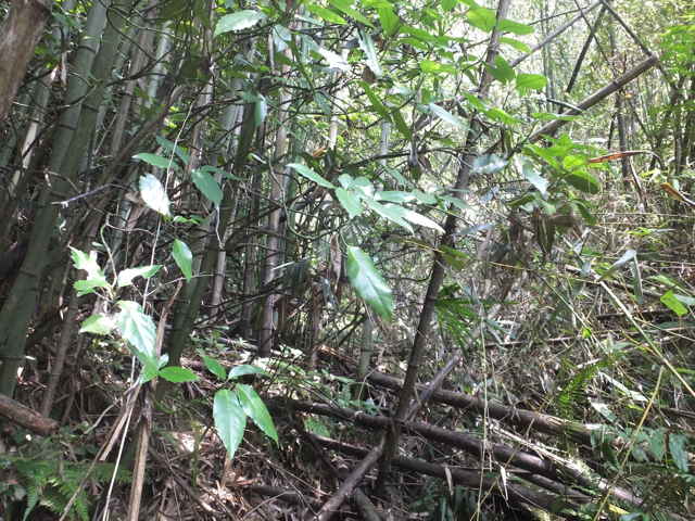 | 11:57 枯竹が倒れ込んだ竹藪を進む。 |