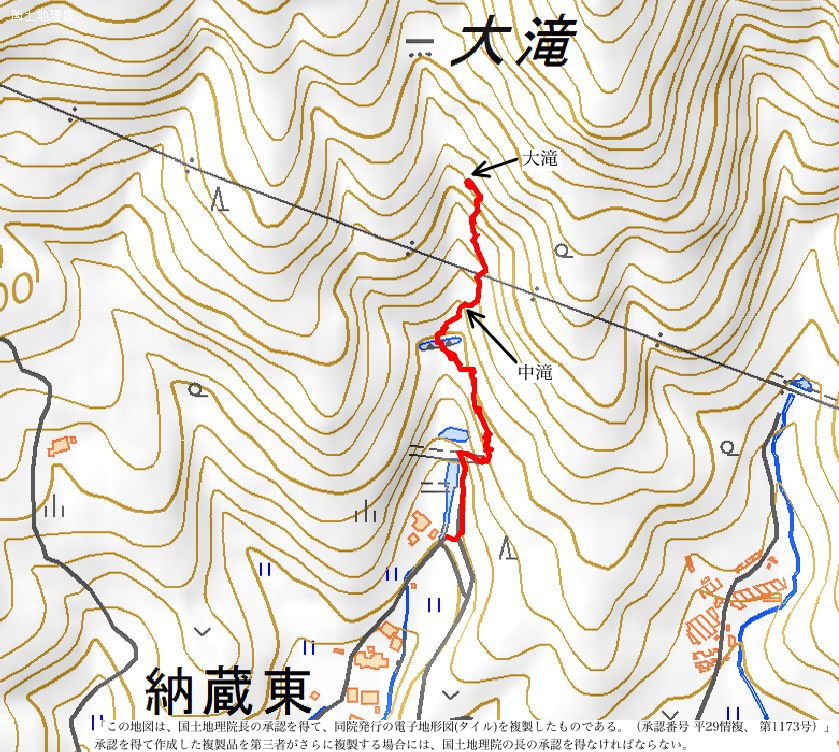 | 滝の最上部。 | 旧版地図では約210mに大滝がある。 |