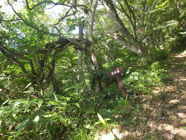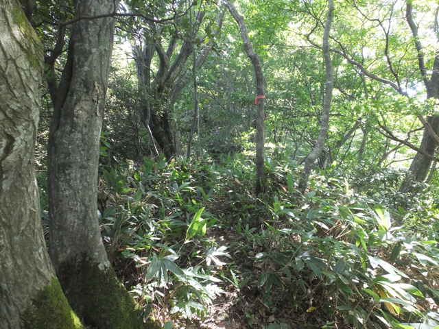 頂上のブナの大木。 | 14:11 笹が密生しているが大出日山へ向かう。 |