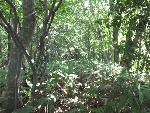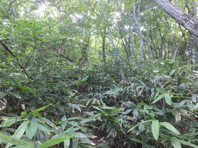 | 14:20 腰高、胸高の笹が密生する尾根を下がる。 |