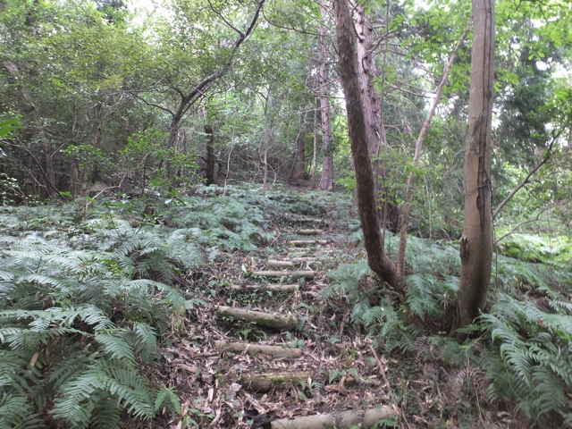 | 今日は、久しぶりに新庄町の嵩山中腹まで延びる林道を上がってみようと思いました。林道は上の方へ上がると、最近は利用する人もないようで、以前にも増して荒れていました。だんだん草は伸び放題になるし、倒木はあるしで、途中で止めることにしました。引き返す途中で、鉄塔への巡視路があったので、入ってみました。島根原子力幹線No.39でした。入って少し上がった巡視路に、最近落ちたと思われる大きな落石が道を塞いでいました。落石を周って、上がっていくと、急斜面につづら折れに、階段が作られていました。息を切らしながら上がった鉄塔からは、中海に浮かぶ大根島を眺めることができました。急斜面の荒れ地に鉄塔があるので、休憩場所にはなりませんでした。雨もぱらつくような天気になってしまったので、早めに切り上げることにしました。 |