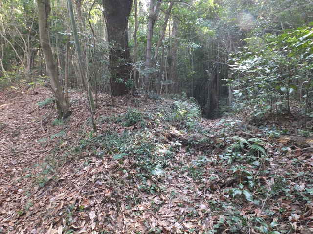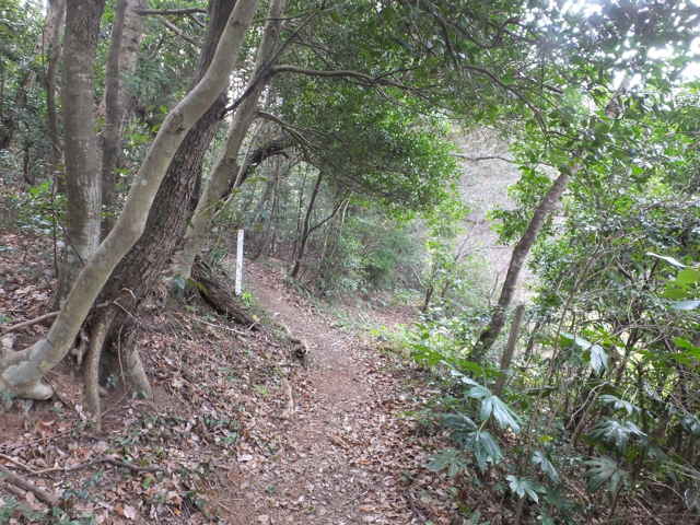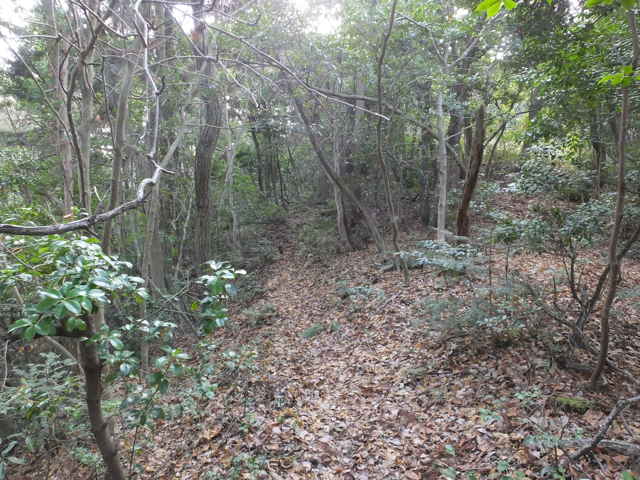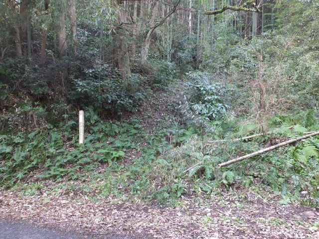 | 古道(巡視路)へ引き返し少し進むと、南への分岐があります。分岐に入ると、すぐに径が分岐するので、まず左へ進んでみました。稜線は広く歩きやすい径が続きますが、斜面を下がるようになると、竹林の中の細い径になり、枯竹を避けながら、下りるようになります。山を出たところは、島根札第12番海潮庵の脇でした。 |