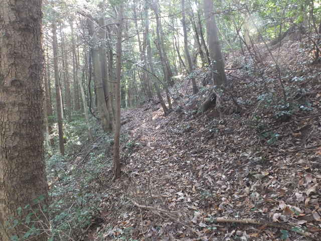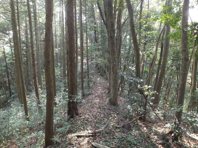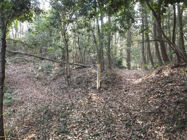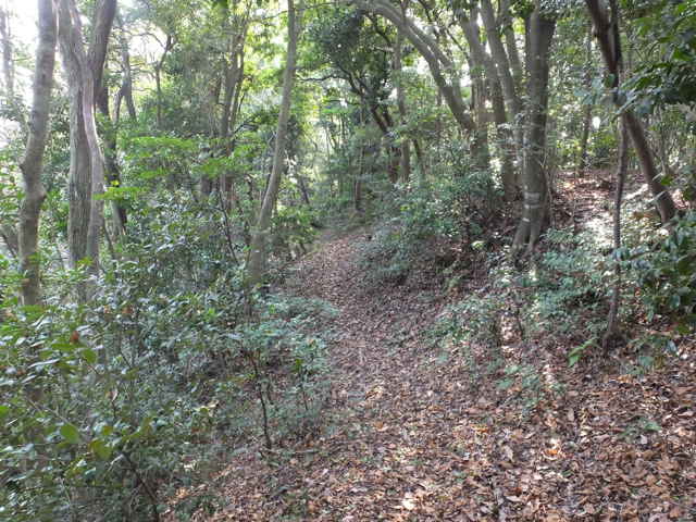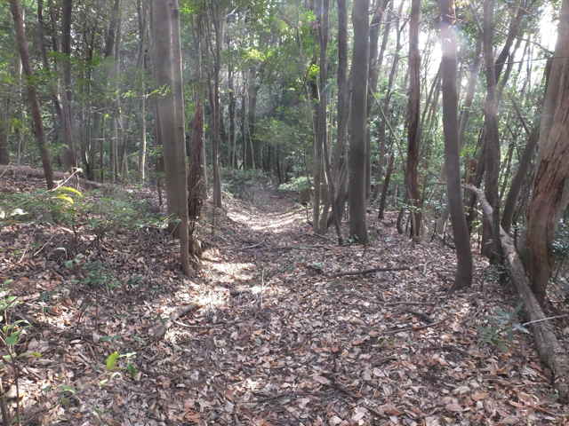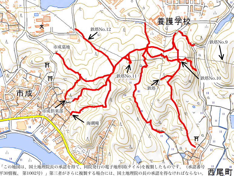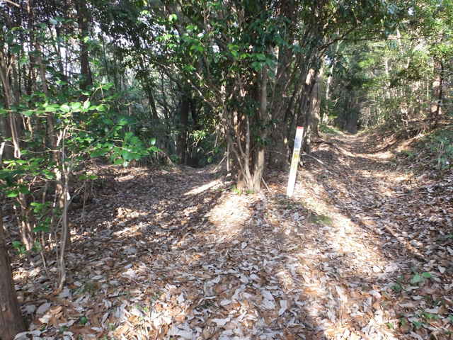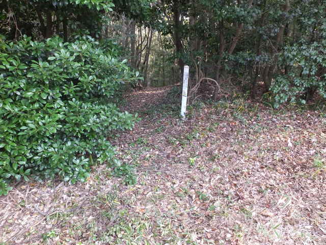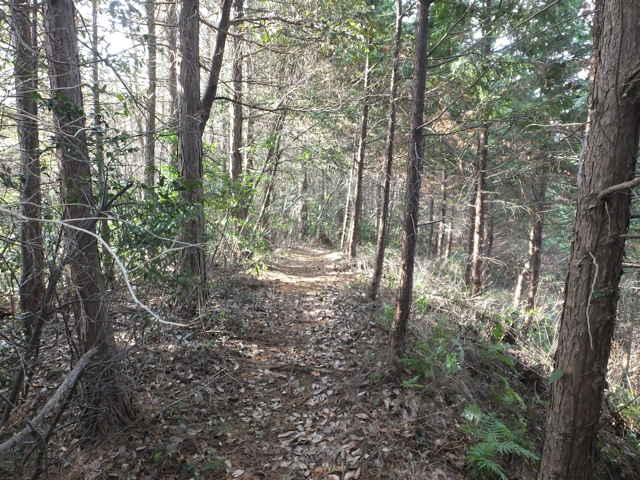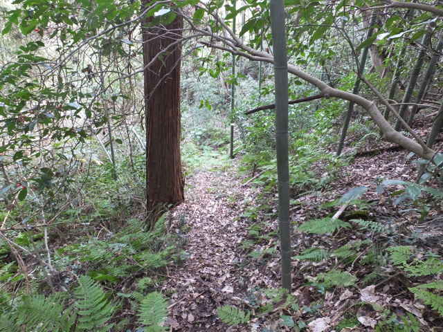 | 鉄塔No.10へ上がってきた古道(巡視路)まで帰って、鉄塔No.10からは古道の先へ向かって巡視路があるはずだったのを確認するのを忘れてしまったので、山裾をまわる径を進み、再度鉄塔No.10の巡視路を上がることにしました。巡視路を進んで、巡視路と養護学校付近と西尾町を結ぶ古い径が交差するところに、鉄塔No.10への分岐があります。ここから広く歩きやすい巡視路が上がっていました。 |