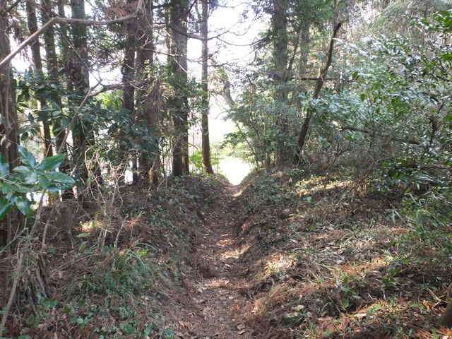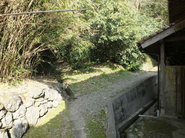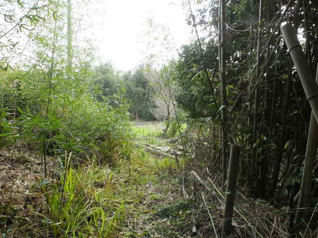 | 分岐のところまで引き返し、直進すると今度はまっすぐ谷の竹林の中を下りていく径になりました。竹藪の倒れた枯竹は片付けられており、今でも人の通りがあるようです。径には30cm角の敷石が並んでおり、古道の雰囲気が残っています。径は竹藪を抜け、畑の脇を通って、民家の脇へ出てきました。市成倶楽部(集会所)の脇から奥へ入った谷でした。 |