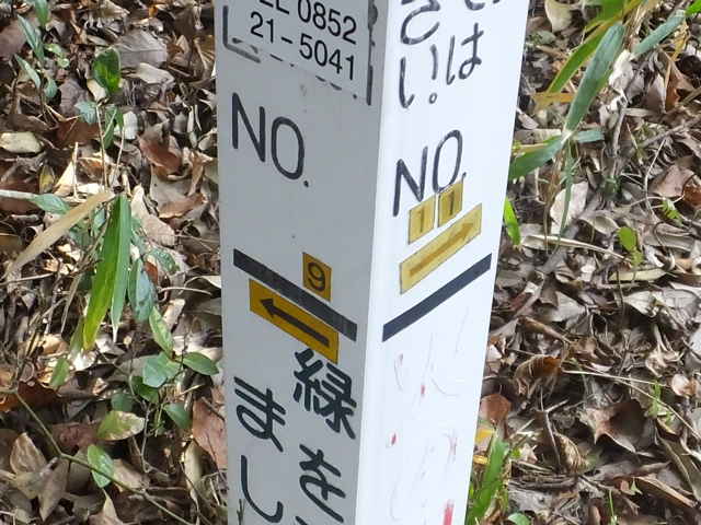 | もと来た径を通って鉄塔No.10まで引き返すと、鉄塔No.9を指し示す標柱がありました。最初は歩きやすい巡視路が続いていましたが、やがて径は細く急斜面になり、枯竹が多くなってきました。道を間違えたかと思いましたが、倒れた枯竹が通れるように切られているので、間違いないと思って下がると、西尾町の細い舗装道路に下りてきました。 |