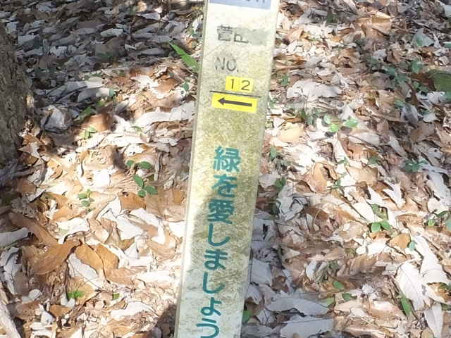 | さらに古道(巡視路)を南へ進んでいくと、北へ向かって分岐があり、鉄塔No.12の標柱が立っています。広く歩きやすい径を行くと、鉄塔を過ぎて、給食センターの近くへ下りてきました。 |