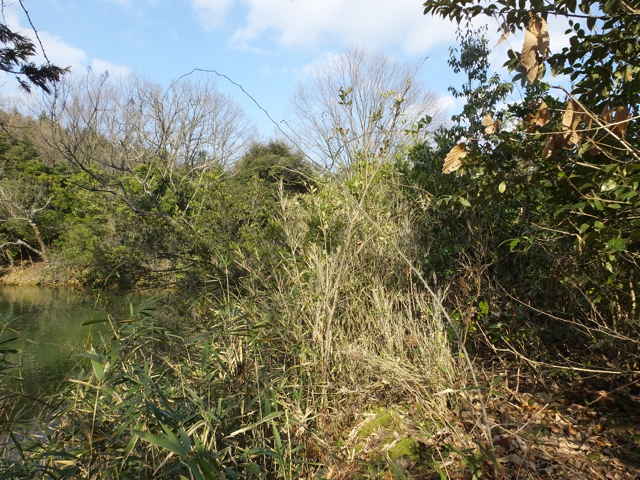 | 上本庄町 池の縁は藪となって通れない。 | 池の反対側から入ると丸木橋で進めない。 | 引き返す池の径は藪となっている。 |