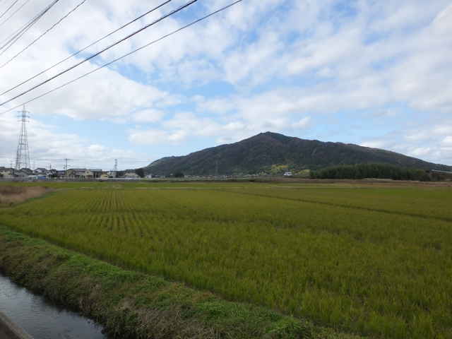田んぼの向こうに旅伏山が見える。 |