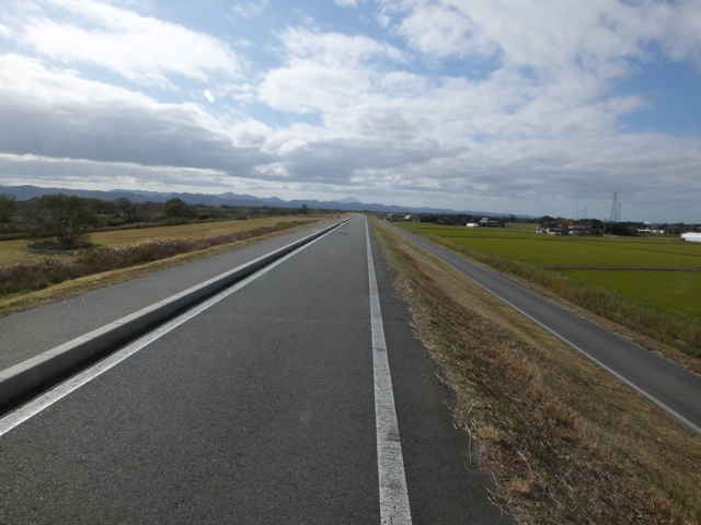 橋から約1.8km、堤防が右へ曲がる |