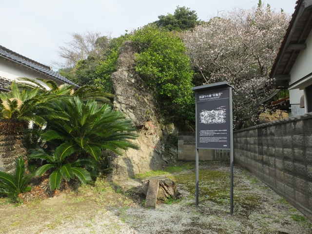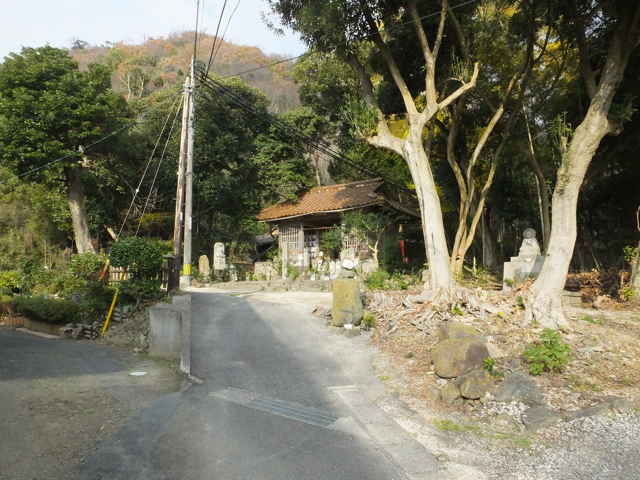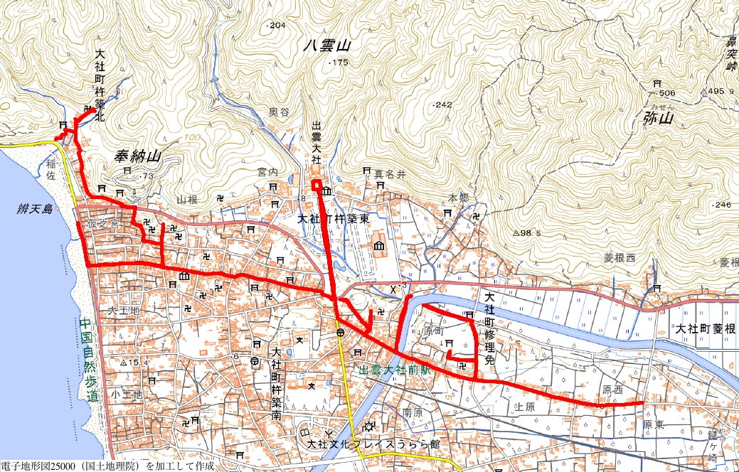 | 今日は、「松江杵築往還」を、出雲市大社町菱根〜出雲大社〜稲佐までの約4kmを歩きました。だんだん出発地が遠くなるので、今回も一畑電車で浜山公園北口駅まで行き、大社町菱根から西へ歩きました。 浜山公園北口駅の東の道路脇に小さなお堂があり、鑓ヶ崎弘法大師堂の縁起を書いた銘板がつけてありました。またその裏には「 先日11月30日に菱根の関所跡を見るために往還を離れたT字路から西へ向かって出発しました。ここから大社町の修理免という地区に入りますが、この地名は江戸時代に出雲大社の修理をすることで、租税が免除されたことに由来するとのことです。T字路から800mほど進み、100mほど北へ入って、西へ100mほど行くと、西原荒神社があります。素戔嗚命他3神を祭神とし亨保二十年(1735)に産土社として創建されました。荒神社から150mほど北に行くと乙見社があります。祭神は下照比売命で、出雲大社の摂社ということです。ここから西へ細い道を入った右手の堀川沿いに乙見温泉があったそうですが、昭和20年に廃止されています。乙見温泉は明治45年に発見されたもので、吊橋で大社から通えたそうで、対岸の堀川沿いに吊橋の橋脚の跡だけが残っています。 往還へ帰って、少し行くと右手に明源寺があり、寺から約300mで堀川に架かる神光寺橋を渡ると、杵築南になります。ここから出雲大社参道(神門通り)に向かって一直線に道が伸び、新馬場通りと呼ばれています。天保六年(1835)以前は、橋から100mのところから、右へ斜めに道が伸び、 元の新馬場通りへ帰り、まっすぐ進むと参道へ出て、勢溜に上がります。現在の出雲大社へ向かう南北の「神門通り」は、明治45年(1912)に国鉄大社駅の開通に伴って作られた道だそうです。 勢溜から西向かって「神迎の道」と呼ばれる道を西へ向かうと300mほどで 乗光寺から約200mほど行くと浜四つ角があり、往還は右へ曲がりますが、まっすぐ海岸へ向かってみました。永徳寺坂を下って国道431号を渡ると、道路沿いに石灯籠が2基立っています。永徳寺坂下の大燈籠と呼ばれ、初代は明治29年(1896)に作られ、その後移設・新設され、3代目になるそうで、初代の台座が残されていました。少し西へ向かった海岸は稲佐の浜で、かっては「沖の御前」と呼ばれた弁天島も今は陸続きになっています。 浜四つ角へ引き返し、往還は北へ向かって進み、養命寺の入口から左折し、約90mほどで北へ向かいます。安養寺前から左へ回り、すぐ路地を北へ進むと国道431号へ出てきます。 養命寺は出雲観音霊場第二番札所となっています。安養寺には、阿国ゆかりの遺品が移され、彼女の念持仏三十三体の観音菩薩のうち二体、愛用の鏡と数珠が伝えられているそうです。 国道へ出て奉納山入口から西へ、往還は70mほど国道に取り込まれています。右へ曲がった角には出雲大社末社の大歳社がありました。大歳社から150mほど路地を進むと、 寺から少し引き返したところに鳥居があり、奥まったところに とりあえず今回で、出雲大社までの「杵築往還」は確認できたので、これ以西の日御碕へのルートは今後の課題にします。 |