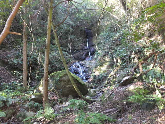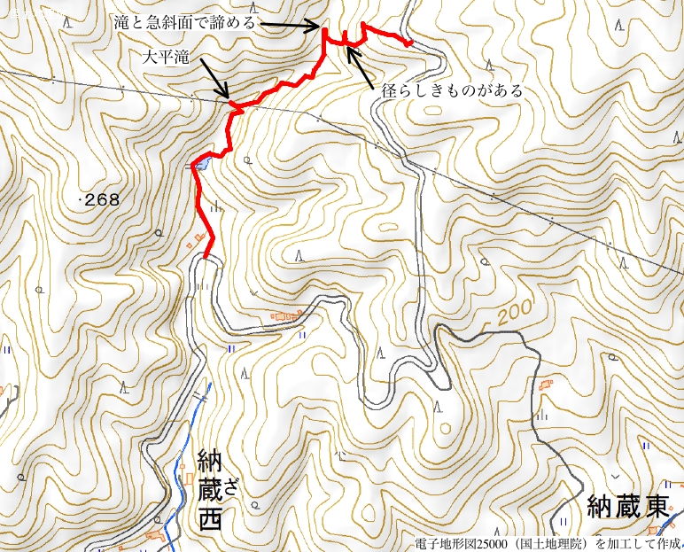 | 大平滝は東持田町納蔵西の林道澄水山線を上がり、白滝から250mほど先の民家の横から谷を入って行ったところにあります。最近案内標識などが整備され新聞紙面でも紹介されていました。 林道澄水山線から左へ入り、民家の脇から谷の奥へ山道を上がっていきます。150mほど入ると右側に砂防ダムの堰堤があり、その先に案内標識がありました。川へ下って、対岸へ渡り、小さな滝を見ながら進んで、標識に従って再度川を渡って、左へ行くと右の谷に大きな滝が見えてきました。砂防ダムからは7分ほどで着きました。 大平滝へのルートは、川沿いへ下りたところがぬかるんで歩きにくいですが、その他は案内標識がしっかりしていて、歩きやすく短い距離ですので、気軽に滝を楽しむことができると思われました。 林道から上がってきた谷には、昔は島根町へ越える道があったことが昭和初期の地形図に載っています。今回少し様子を見ることにしました。滝の手前の川を渡った右側(右岸)に踏み跡らしきものが上がっているのが見えました。上がっていくと、小さな滝が何個かあり、足場の悪い急斜面を歩いて滝を越えました。これが径だったのかとも思いましたが、滝の左側の斜面に石が積まれ石垣が作られていました。上がってみると、たしかに石垣の上には径が伸びていました。下流の方向にも径があるように見えます。さらに上がっていくと、急斜面に径の跡は消え、谷は滝があり、動けなくなってしまいました。 今回は、ここまでと諦めて林道へ向かって急斜面を上がることにしました。急斜面を少しよじ登ると、径らしきものが左右に続いていました。どこからか径は少し上を通っていたようです。少し下がってみましたが、薮となっており、また上流へ向かっても薮となっているため、やはり林道へ向かうことにしました。 斜面をさらに上っていくと、左右にトラバースする細い踏み跡が続いていました。植林地があるので、そのための径ではないかと思われました。さらに斜面を上がると、やっと林道へ出ることができました。 確かにこの谷に径があったことは確認できたので、次回は歩けるルートがないか探してみたいと思います。この旧道を、とりあえず持田川旧道(仮称)と呼ぶことにします。 |
