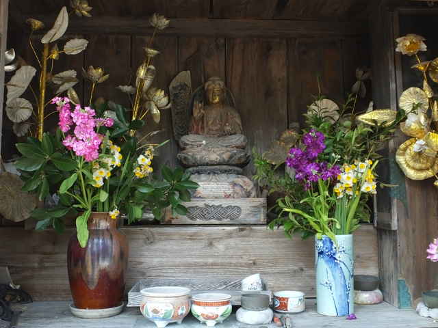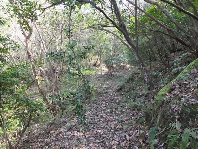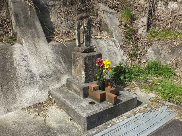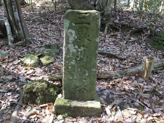 | 今日は、2月18日に手角町の入り口まで歩いた美保関往還の続きを歩いてみます。 初めに先日写していなかった野原町の宮ケ鼻にある八幡宮に寄ってみました。境内には稲荷神社もあり、石段の手前には、狛犬の代わりに狛狐が向かい合っています。また稲荷神社には小さな石狐が無数に納められていました。 国道を進むと、手角の集落の手前に春日神社があります。資料には境内に数体の鹿の石像があると記されていましたが、見当たりませんでしたが、よく探すと、隅の方に壊れた鹿らしき石造りの動物が2体ありました。 国道をから手角の家並みの間の旧道を進み、国道を横断して、美保関町下宇部尾の万原集落へ入ります。集落の間を進むと、十字路に辻堂があり、中に薬師如来像が祀られています。また辻堂の隣には、「泰雲院殿」と刻まれた井戸平左衛門の石碑や三界万霊塔、石地蔵が並んでいます。辻堂から50mほど進んで、左の山手に向かって民家の間の路地を100mほど入っていくと、小さな神社がありました。民家の間の路地は、この神社の参道として管理されているようです。神社の前から谷に沿って径が続いており、3分ほど歩くと谷は左へ曲がり、径も左へ曲がっていました。しばらく歩いても谷を上がるだけのため引き返すと、谷が曲がったところに、山へ入る径が分岐していまいました。林内へ入ると、すぐに分岐があり、尾根へ向かって上がっていきます。尾根の鞍部に上がると、右手の少し高い位置に石塔があり、資料のとおり「三界萬霊塔」と刻まれていました。鞍部から左へ尾根を上がるように、はっきりとした径があるので進んでみましたが、北へ尾根を上がっていくようなので引き返し、まっすぐ竹林の中へ進みました。竹林は枯竹が倒れ込んで、径も見えませんが、枯竹の向こうに径があるような空間が見えました。枯竹を踏み越えて進むと、やはりはっきりとした広い径が続いていました。径はすぐに開けた場所に出てきて、畑の跡のようで、草で踏み跡が見えづらくなりますが、蜜柑の木の脇を通って左へ下りているようでした。竹林内を下がって行くと、消防署の先の国道に下りてきました。 このルートでは、資料によって予定したルートと少し違うので、国道を引き返して様子を見ました。消防署の手前の国道脇に民家があり、その脇から径が上がっているようなので、確認してみました。しばらく上がると、先程の蜜柑の木があった畑の跡に着きました。蜜柑の木から右の方へ下りるのが、ルートのようです。 消防署から国道を進むと、下宇部尾の集落の入り口は切通しになっていますが、昔は山が張り出していたようで、資料では少し北へ入って元保育所から下がって集落へ入るとなっています。元保育所への径を上がってみると、入り口手前に左の山から下がってくる径があるので、たどってみました。径は切通しの法面の上を通って、墓地の脇を抜け、国道付近へ下っているので、これが昔の径のようです。国道から元保育所へ入る道の脇に石地蔵がありましたが、道路工事によって移されたものかもしれません。元保育所から奥へ入ってみると、木陰に塞の神なのか、石が二段に積まれて、祀られているようでした。ここから国道へ下りる径があったのでしょうが、斜面が急勾配に切られて、下りることができませんでした。北へ向かって径が下りていたので、民家の脇を通って大回りをして下りました。 上宇部尾の港を過ぎて、畑の脇の細い径を入り、右へ少し進んだ所から山へ入ります。近くの畑の人に聞くと、「昔はよく頂上の石碑へお参りをした。今はもう大分荒れているだろう。」と山へ入る径を教えてもらいました。山の入口は、草が多くなっていますが、山へ入ってしまうと、広い径が続き、概ね径の状態は良好で、言われるようには荒れていませんでした。一部だけ尾根筋から離れて斜面を回り込むところで、シダが多くなって、径が見えなくなるところがありました。峠には3基の石碑があり、玉菊姫の碑や一字一石塔が並んで建てられていました。資料によると姉妹の姉がここで亡くなった等の伝承があるようです。 峠を越えた森山側が少し荒れた感じで、谷の竹林内は径がはっきりわからなくなりますが、谷を下がるのみなので、迷うことはなく、竹林を抜けると、径がはっきりします。林内を出たところで、谷を左へ渡ると、作業道に出会い、ホテルの脇から国道へ出てきます。 |