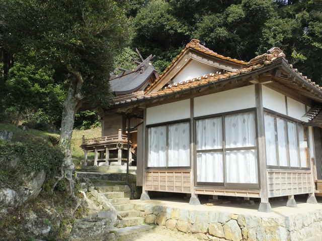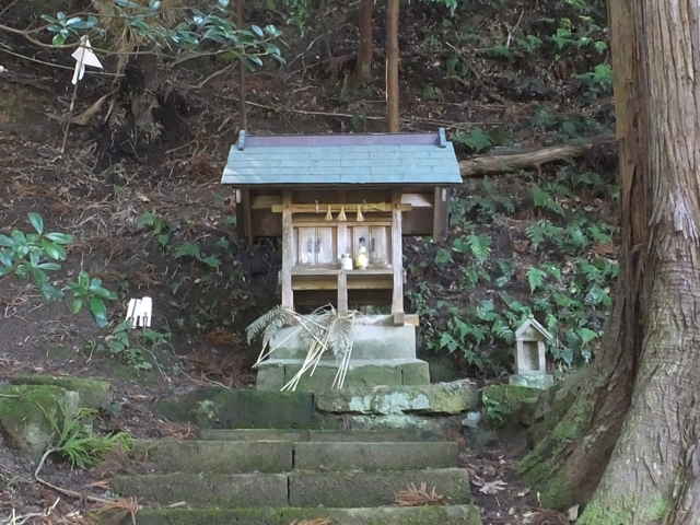| 11:52 美保関町下宇部尾万原 十字路を直進し、民家脇から路地を入る。 | 11:55 小さな神社がある。 | |