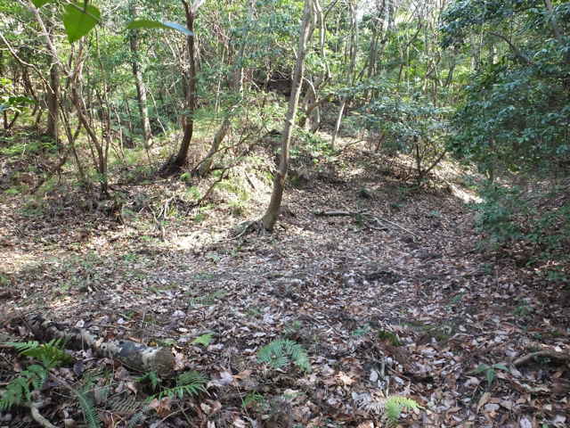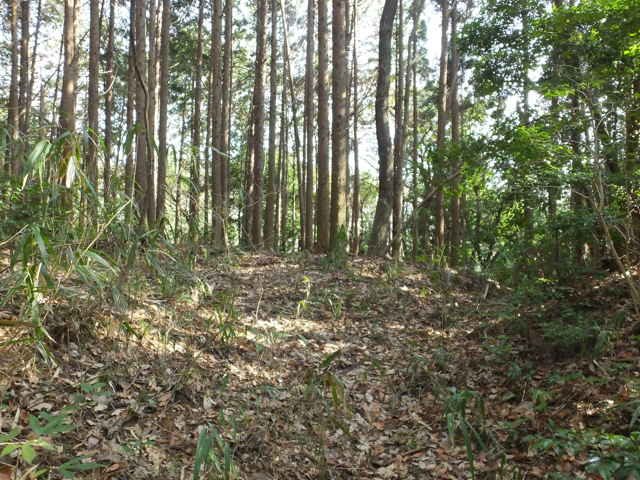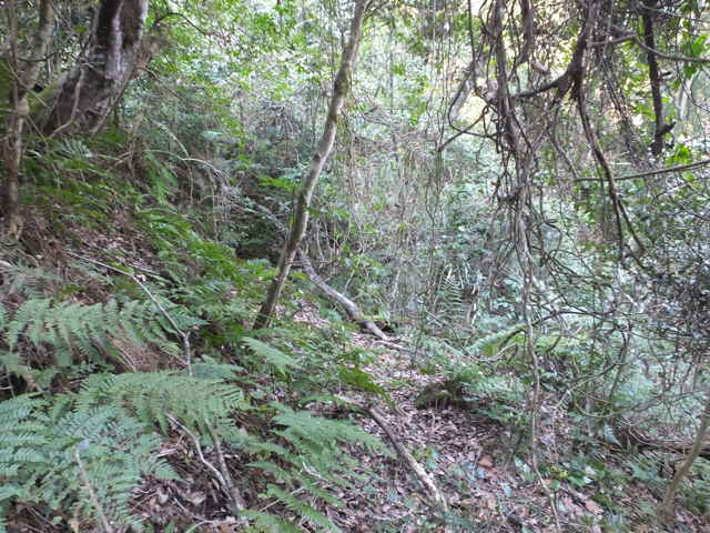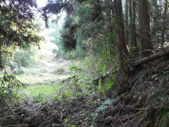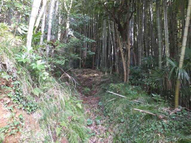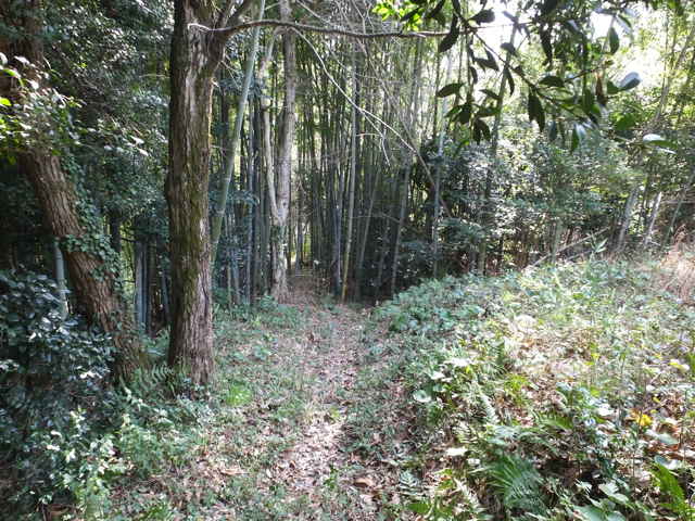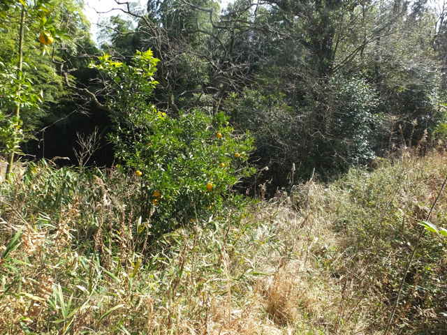 | 12:25 畑の跡へ出てくる。 | 蜜柑の木の脇から左下へ下る。 | 12:27 竹林内を行く。 |