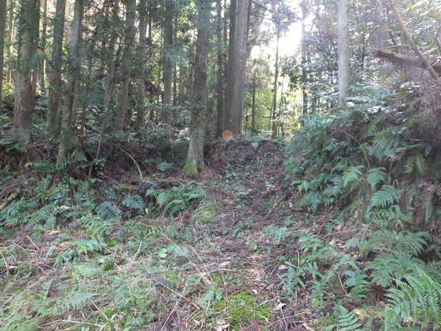 | 14:09 左右への分岐を、左へ尾根を上がる。 | 14:12 径の脇に石垣上のものがある。 | 14:15 枝が伸びている。 |