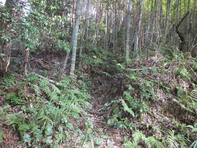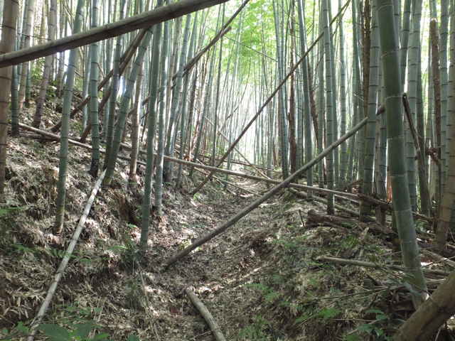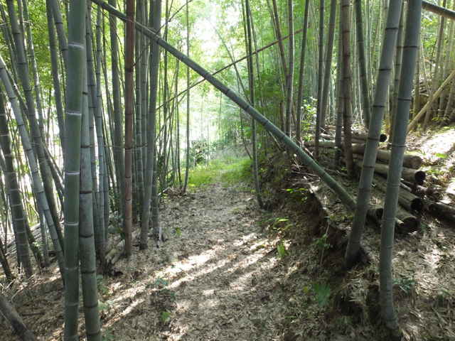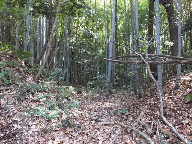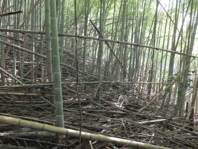 | 12:20 引き返し、まっすぐ竹林へ入る。 | 12:22 枯竹があるが、その向こうに径が見えた。 | 12:24 枯竹を乗り越えると径がある。 |