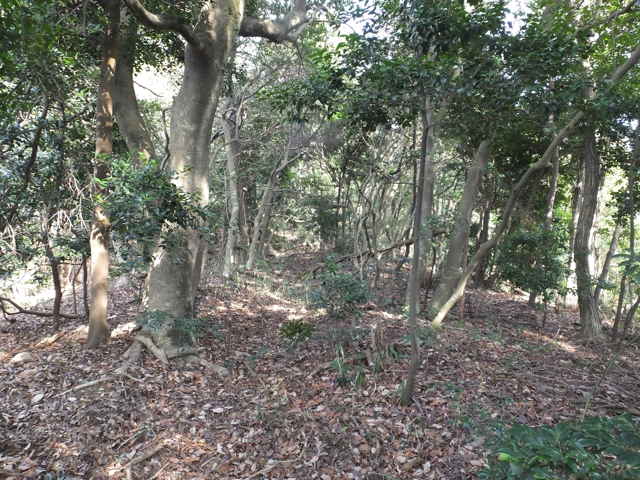 | 木の陰に石が祀られている。 | 急傾斜で下りられない。 | 北側に径がある。 |