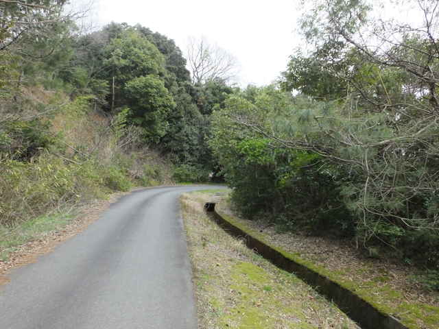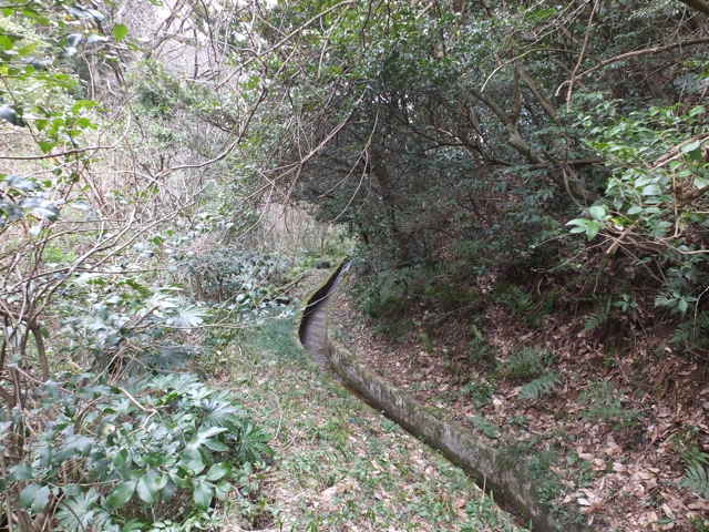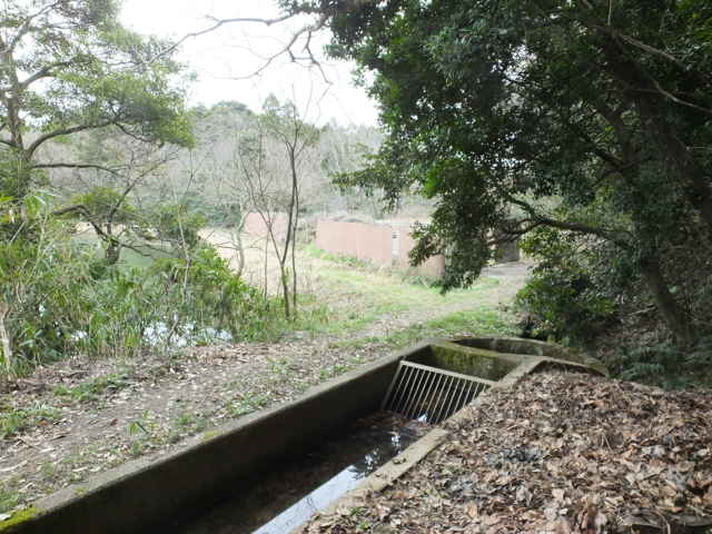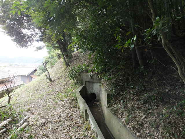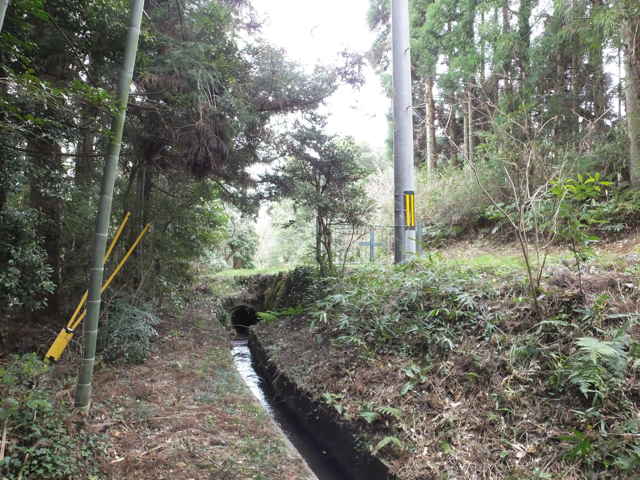 | 竹矢町 道路脇を進む。 | 水路は暗渠となって道路を渡る。 | 暗渠は林内の径の下を行く。 |