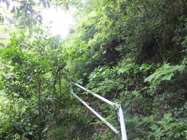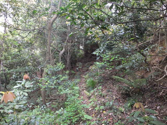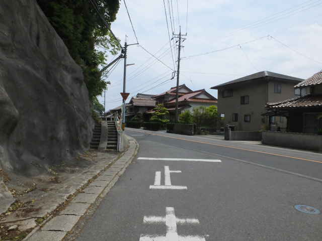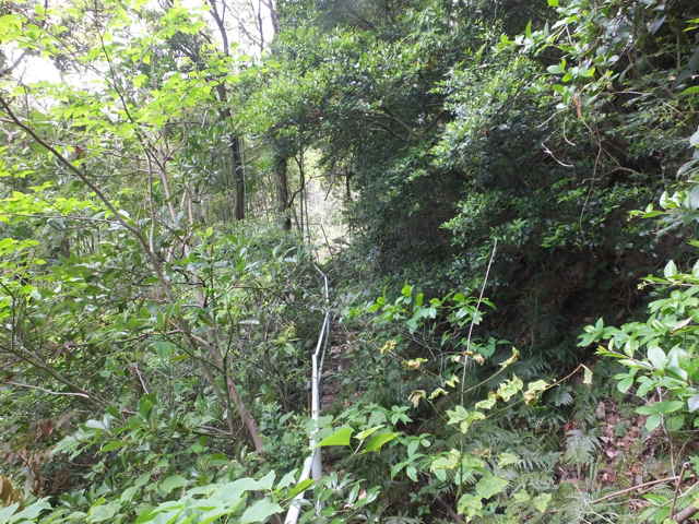福浦から宮ノ谷までは、県道を進みます。資料には「『天王さん』の前を通って宮ノ谷に入る」とありますが、「天王さん」が何を指しているのかわからず、地元の人に聞いてみると、はっきりしませんが、入口の山を「天王さん」と呼んでいたという話もありました。県道から少し集落にはいると、民家の間を東へ伸びる路地があり、これが往還のようです。民家の間を抜け、空き地を横切って、「なべや別館」のある道路法面の崖上を中学校跡地の前まで続いていたようですが、今は通れそうにありません。 中学校跡地の広場を東へ進むと、突き当りから斜面を北へ向かう踏み跡が上がっています。あまり藪になっていないので今でも使われているようです。径はどんどん上がっていき、畑のような場所に出ますが、資料とは少し上がりすぎているようです。少し引き返して、東へ入れる径を探し、踏み跡らしきものをたどってみました。畑の跡に植林したような林を過ぎると、径らしき感じもありますが、やがて藪となって、進めなくなってしまい、このルートは諦めました。 県道へ戻り、玉井斎場の前を通って、 県道雲津線を集落へ少し入り、山へ入る径を探し、荒れ地にあった踏み跡を入ってみますが、その先の急斜面の竹林に径のようなものは見えません。竹林のすぐ上が県道雲津線なので、急斜面を竹につかまりながら上がりました。上がった場所の向かいの道路斜面に、踏み跡が上がっていて、少し荒れていますが、すぐに尾根筋へ上がり、栗畑になっていました。栗畑を抜けると、県道雲津線に出会い、県道を上がると「男鹿古墳」の案内標識があり、その先の右手の墓地から下がっていくと、法面擁壁の階段があり、西長浜集落へ下りてきました。集落の県道脇に「泰雲院殿」(お芋さん)の石碑と五輪塔がありました。 県道を東長浜へ進み、集落の奥へ入ると墓地がありました。墓地の右奥から山へ向かって径が上がっています。男鹿から雲津へ向かう車道ができるまでの、長浜越の旧道になります。径にはコンクリート板が敷いてあり、また所々に手すりのようなものも残っていました。径は峠まで、つづら折れに上がっています。木々の枝が伸びて、荒れ放題になっていて、道路の名残がなければ、径をたどるのを諦めていたかもしれません。 往還は県道雲津線に出会う手前から、更に斜面をトラバースして尾根へ向かって上がっていき、畑の跡のような平場へ着きました。ここから東へ向かって径を探しますが、やがて藪となって、踏み跡らしきものもなくなってしまいました。ここから杢井越まで、あと500mほどですが、このルートは諦め、松江美保関往還の踏査はここまでとしました。 |