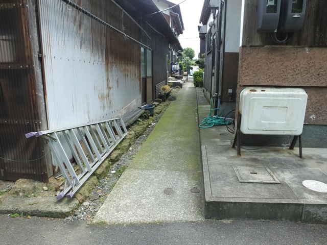 | 美保関町福浦宮ノ谷 路地が伸びている。 | 車の左横が路地の続きと思われる。 | 往還は法面上を通っていた。 |