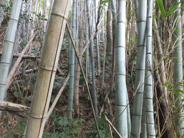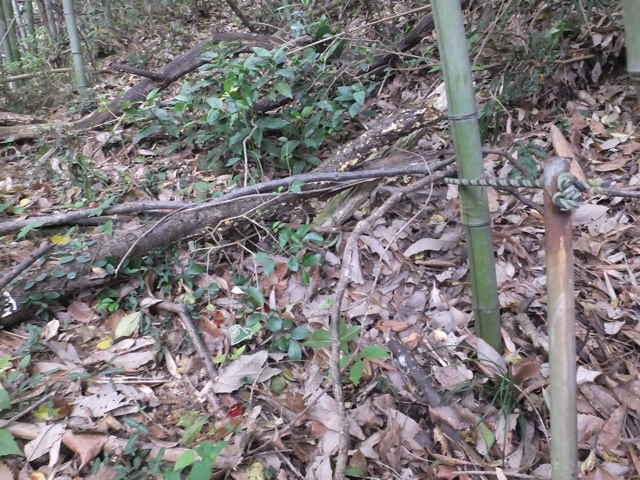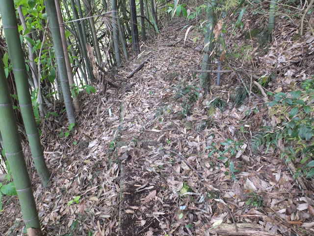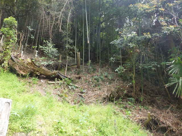 | 美保関町福浦男鹿 県道雲津線を集落へ入る。 | 集落奥の荒れ地の踏み跡を東へ入る。 | 径は見えないが、急斜面の竹林を上がる。 |