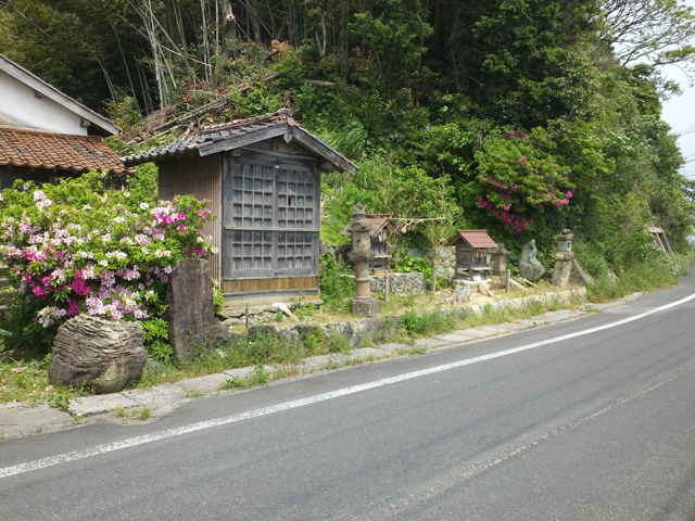 | 美保関町福浦 玉井斎場の前の県道を進む。 | 道路改良で西からは集落へ入れない。 | 東側入口 歳徳神・荒神・恵比寿神などがあるという。 |