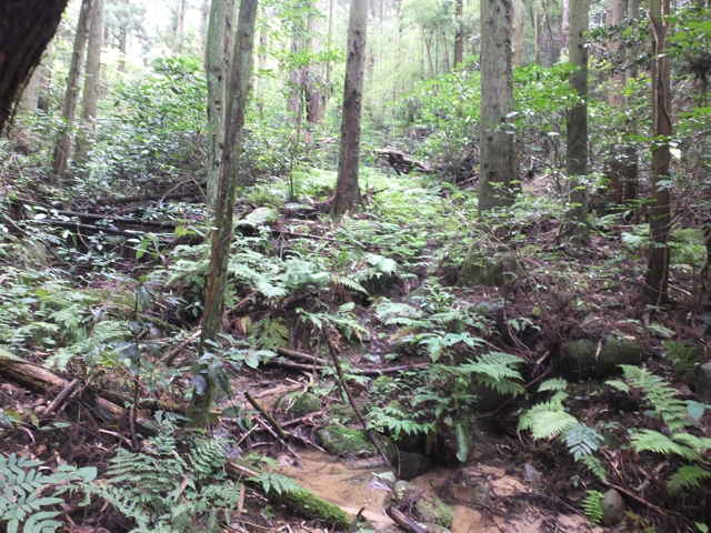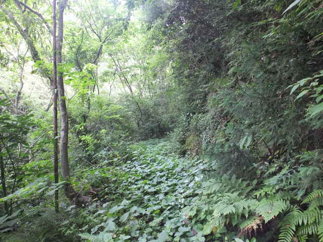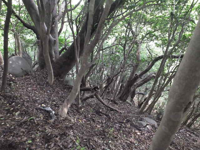 | 鹿島町上講武から大平山への登山道は、トンネル手前の擁壁上から入るのですが、地形図にはさらに手前の石井川の谷から上がるルートが描かれています。以前から気になっていて、谷の奥の砂防堰堤の脇を上がってみたこともありますが、径は不明でした。堰堤手前から川の対岸を上がっているようですが、現在は藪になっていて通れそうにもありません。堰堤の奥の谷から、尾根に向かって上がり、地形図のルートを探してみようと思います。 堰堤を越えて谷の奥の竹林に入ったところから、対岸の斜面の上がれそうな場所を探しました。急斜面を獣道を頼りに、木々につかまりながら、尾根筋に向かって上がりました。なんとか尾根筋に上がると、はっきりした径が尾根を下っていました。どこから上がっているのか、確かめようと下ってみました。しばらくははっきりした径がありましたが、10分ほど下がると、藪になって径もなくなってくるので、ここまでで諦めて引き返しました。 元へ帰って尾根を上がって行くと、やがて密生した竹林となって、竹の間を縫うように斜面を上って行きます。竹林を抜けると急斜面となり、掴まるものが少なくなり、掴まれる木を探して上がっていきました。また大きな岩がごろごろしていて、これを回り込むように上がりました。 急斜面を上がり切ると、尾根径になりますが、20分ほど上がると藪になって、全く踏み跡などなく、木々の枝を切り払いながら進みました。10分ほど藪を上がると、やっと登山道に出会いました。登山道と出会った場所は、地形図とは200mほど西になりました。大平山の西のピークは古い地形図では小城山となっています。 急斜面を上がってからは、概ね尾根を歩いていたつもりなのですが、13:35位から西へずれてしまったようです。また急傾斜の斜面を上がるところは、足をすべらせれば転げ落ちそうなので、こんなルートが地形図に載るのもおかしいので、径が崩れ落ち消えてしまっているのかもしれません。東へ向かうような分岐はなかったような記憶ですが、機会があればもう一度、ルートを確認してみたいと思います。 |