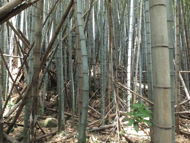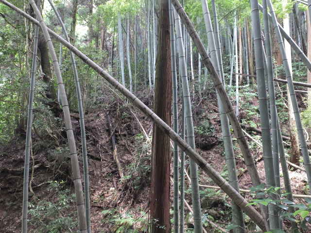 | 12:31 藪が深くなり、下がるのを諦める。 | 12:41 元へ引き返し、尾根筋を上がる。 | 12:53 密生した竹林を抜けていく。 |