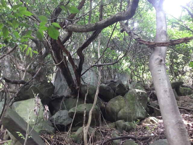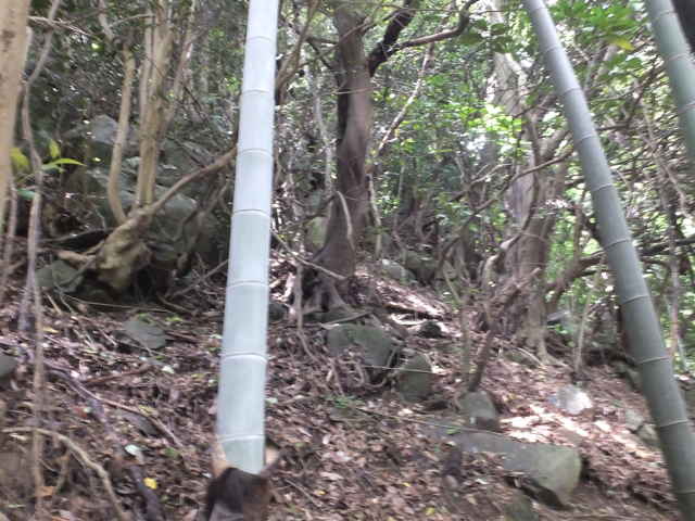 | 13:00 竹林を抜け出した。 | 13:09 石の多い急斜面を上がる。 | 13:12 大きな岩がある。 |